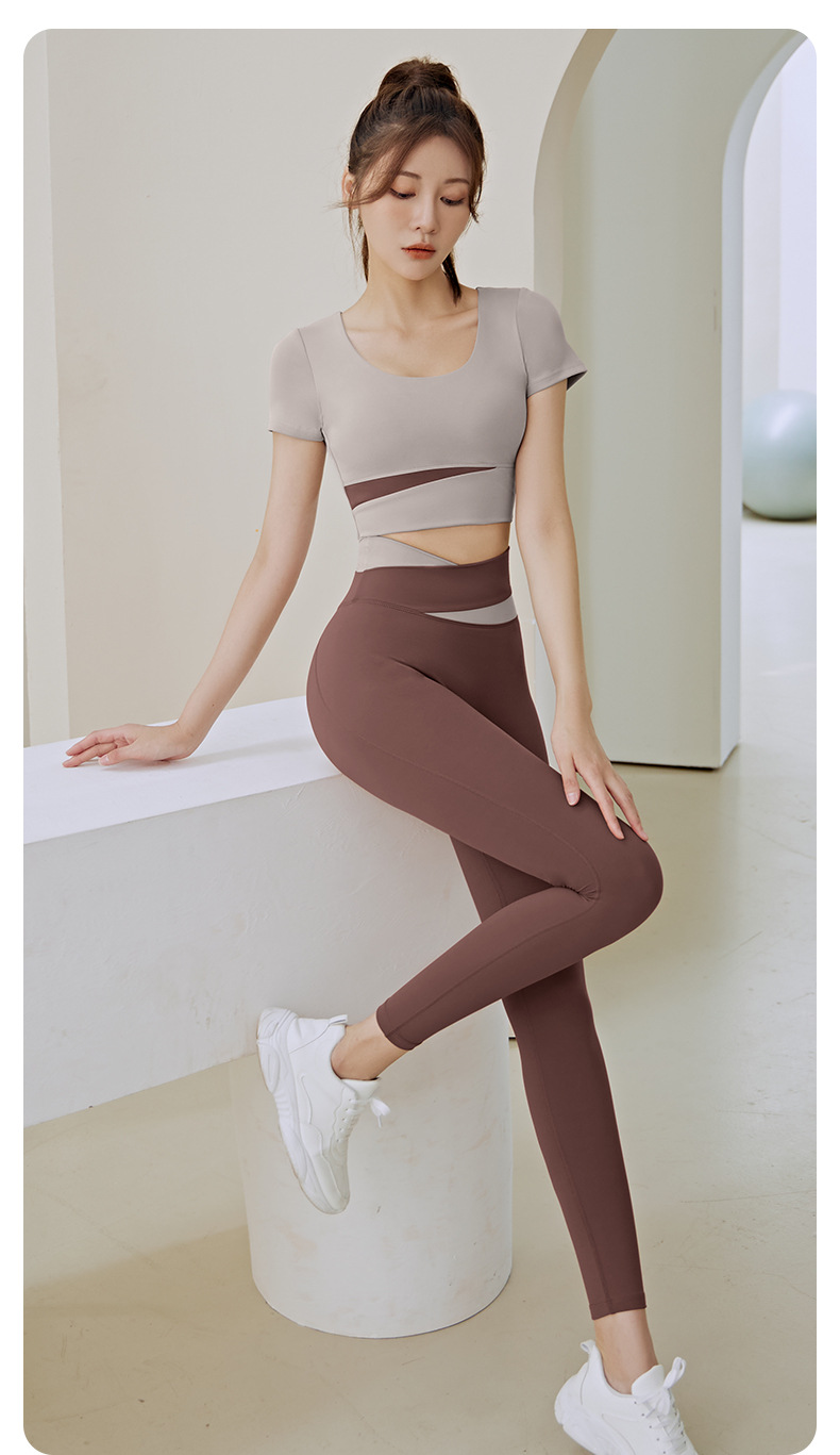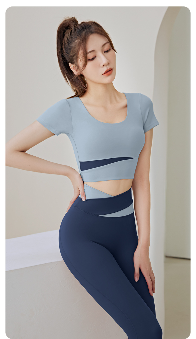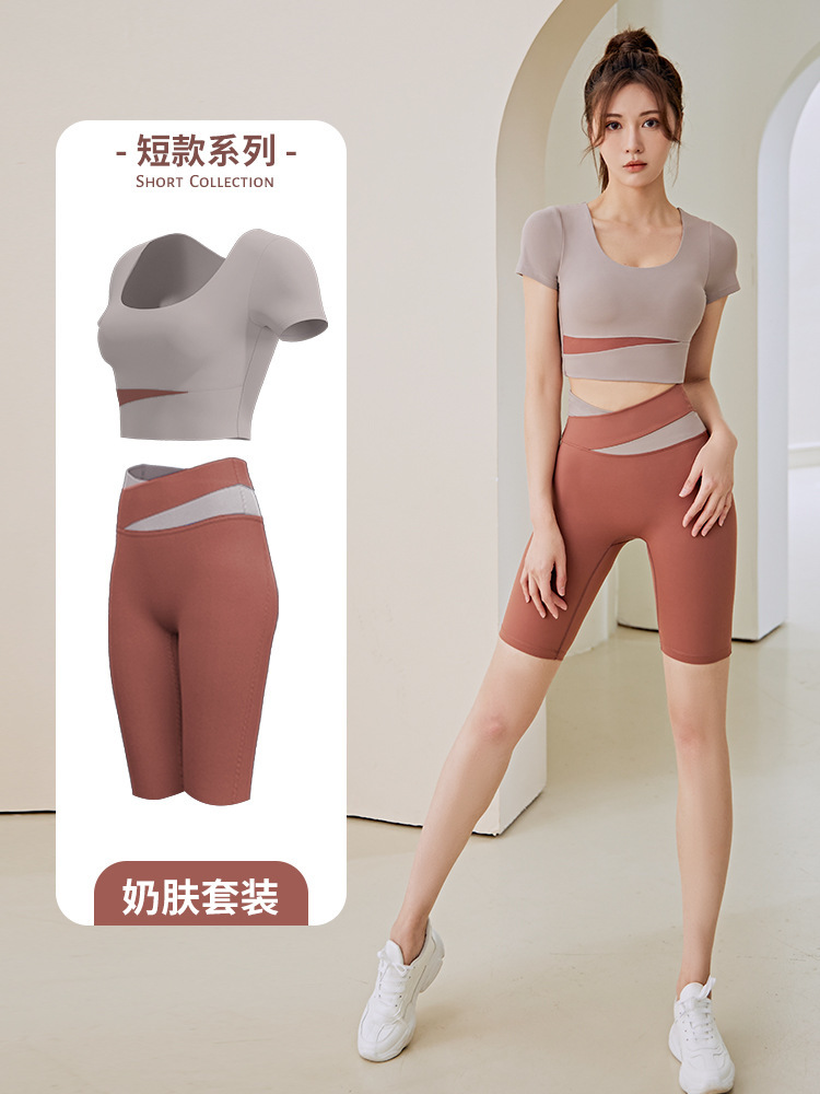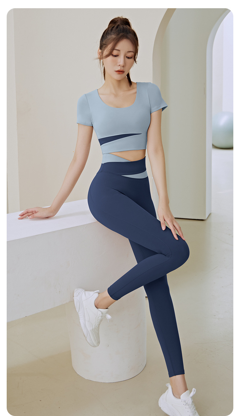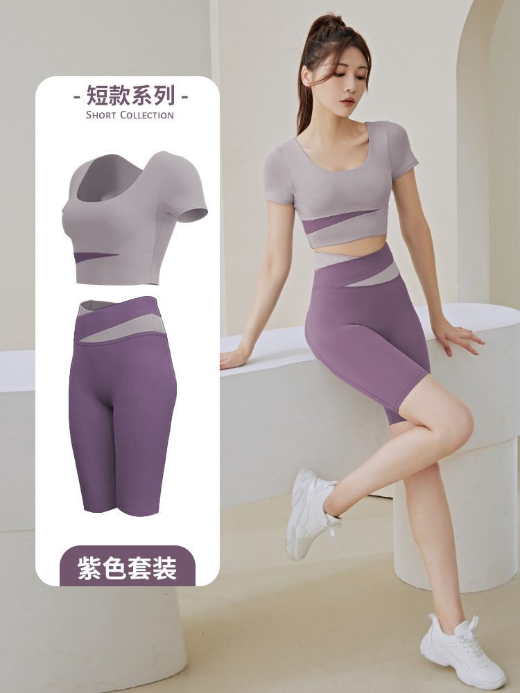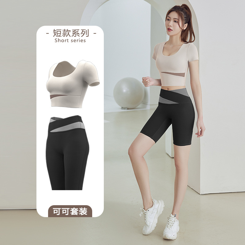 컬러 블록 반팔 요가 세트 여성의 봄과 여름 배꼽 짧은 최고 엉덩이 바지 달리기 스포츠 피트니스 세트