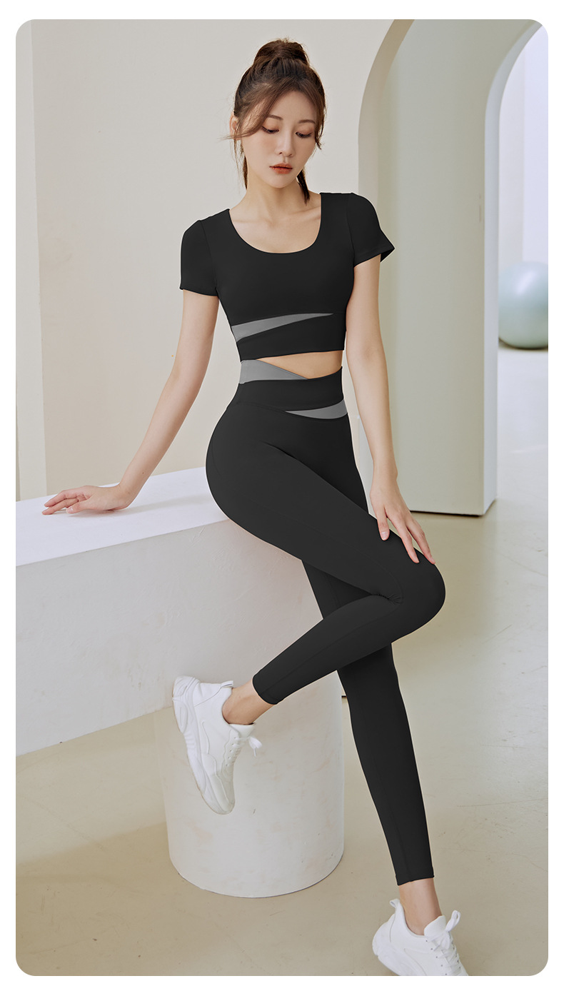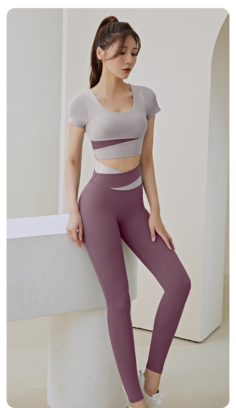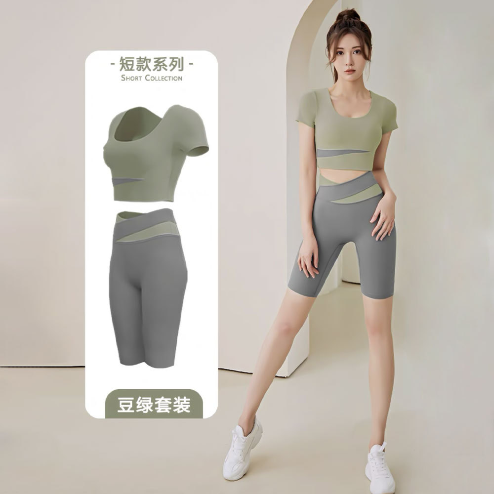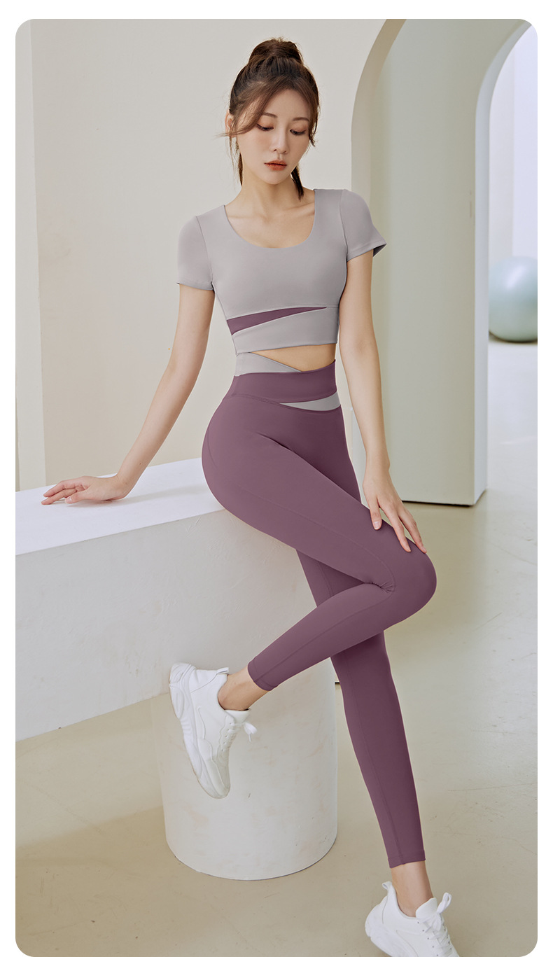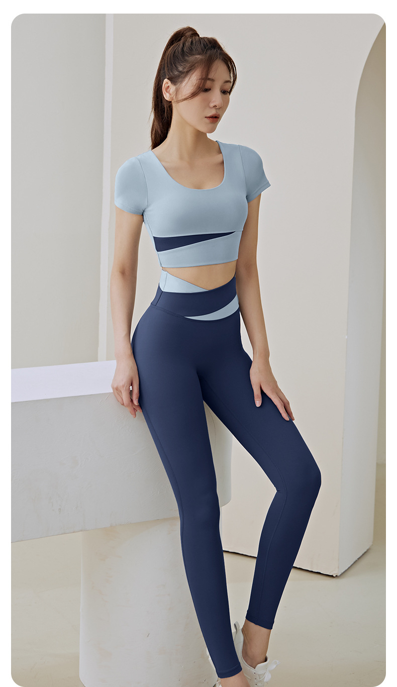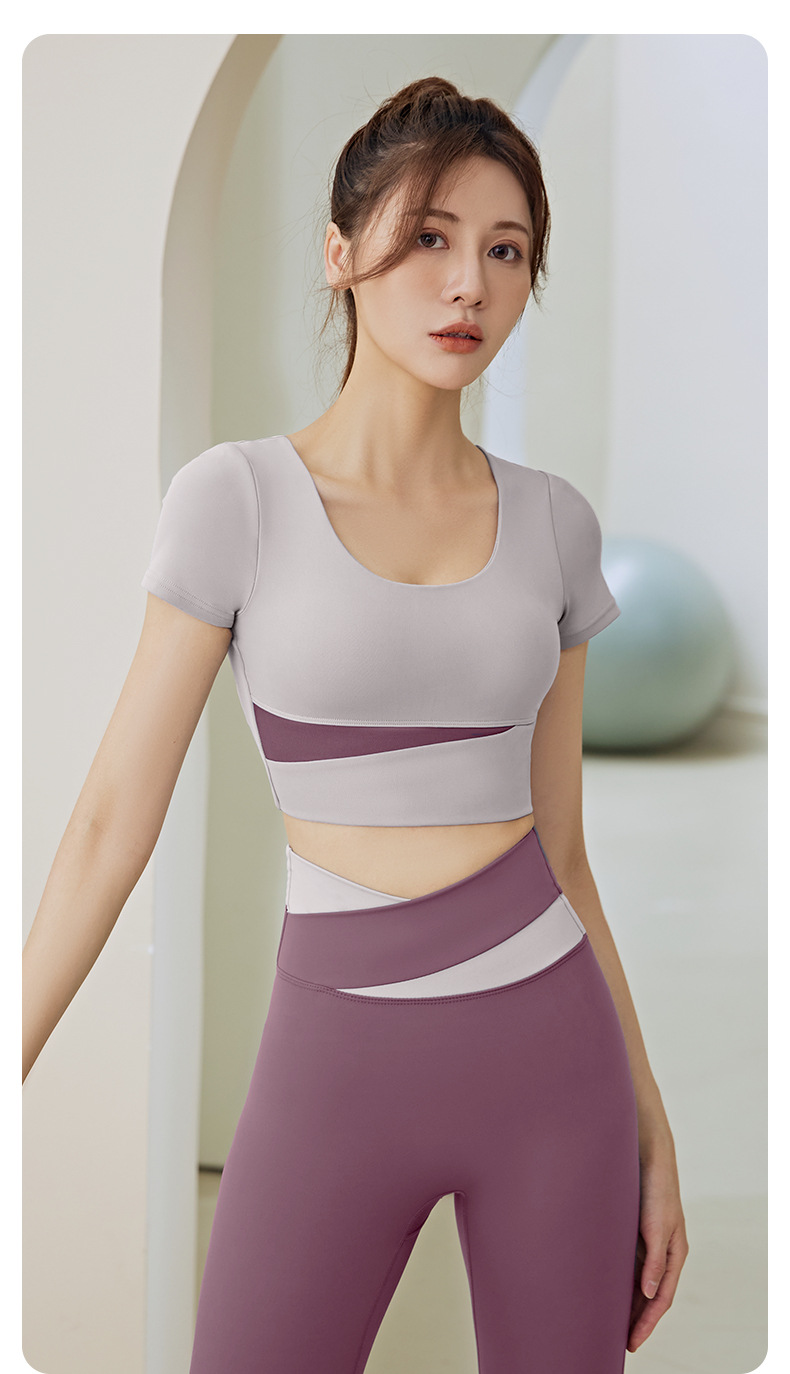컬러 블록 반팔 요가 세트 여성의 봄과 여름 배꼽 짧은 최고 엉덩이 바지 달리기 스포츠 피트니스 세트
