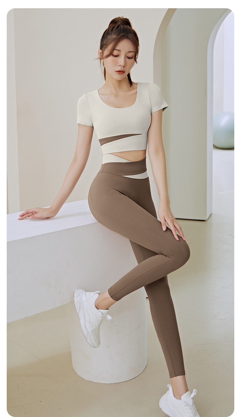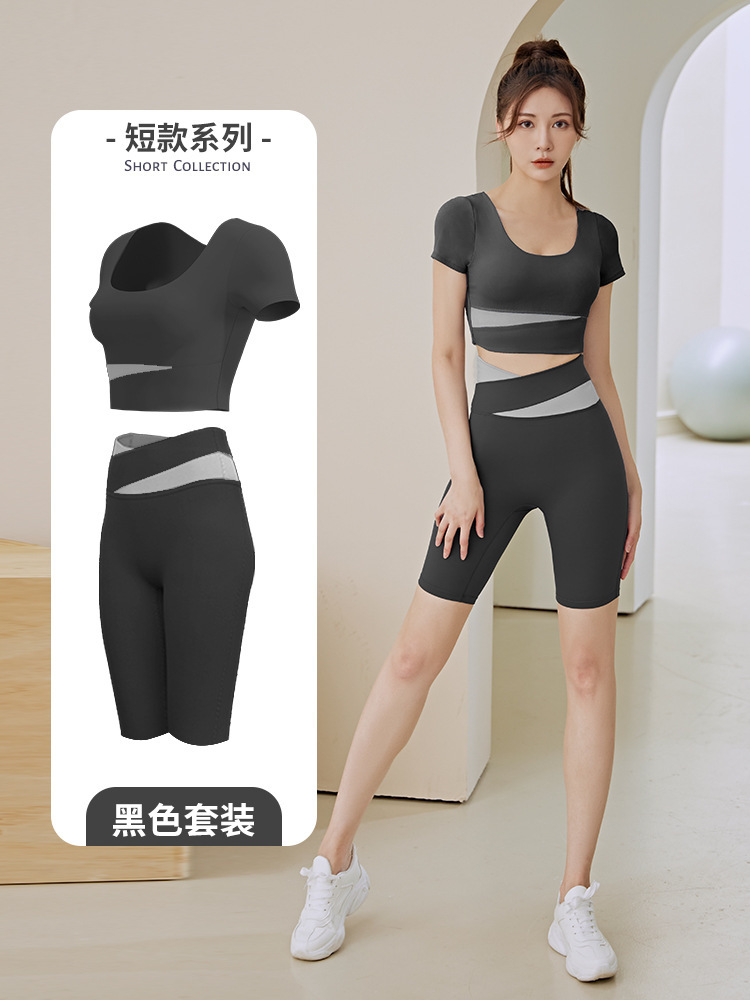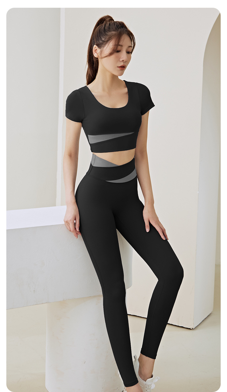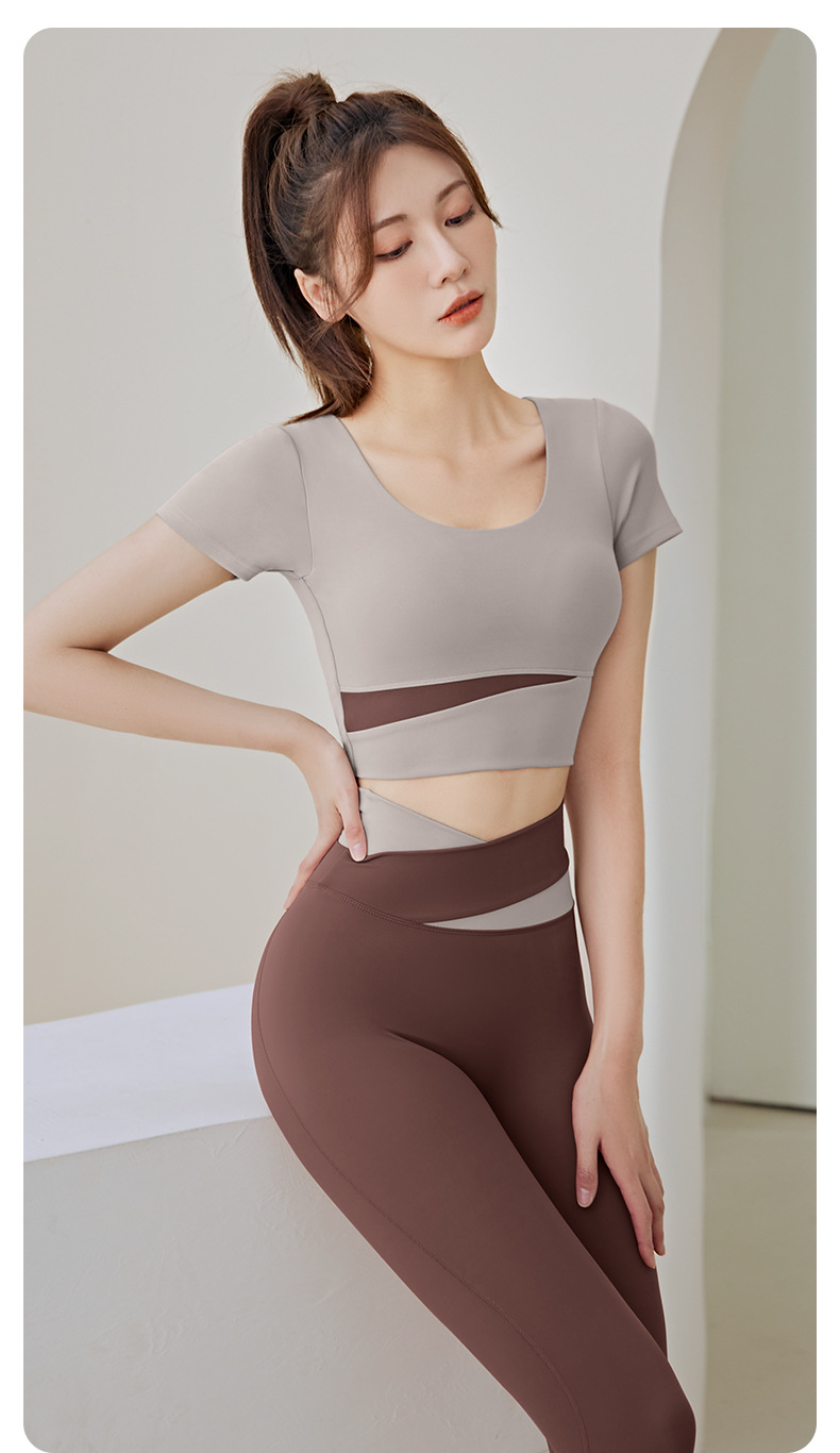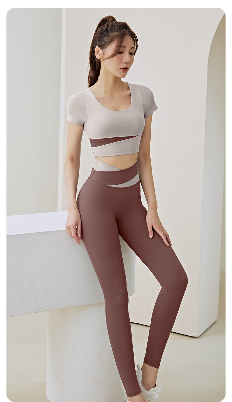 컬러 블록 반팔 요가 세트 여성의 봄과 여름 배꼽 짧은 최고 엉덩이 바지 달리기 스포츠 피트니스 세트