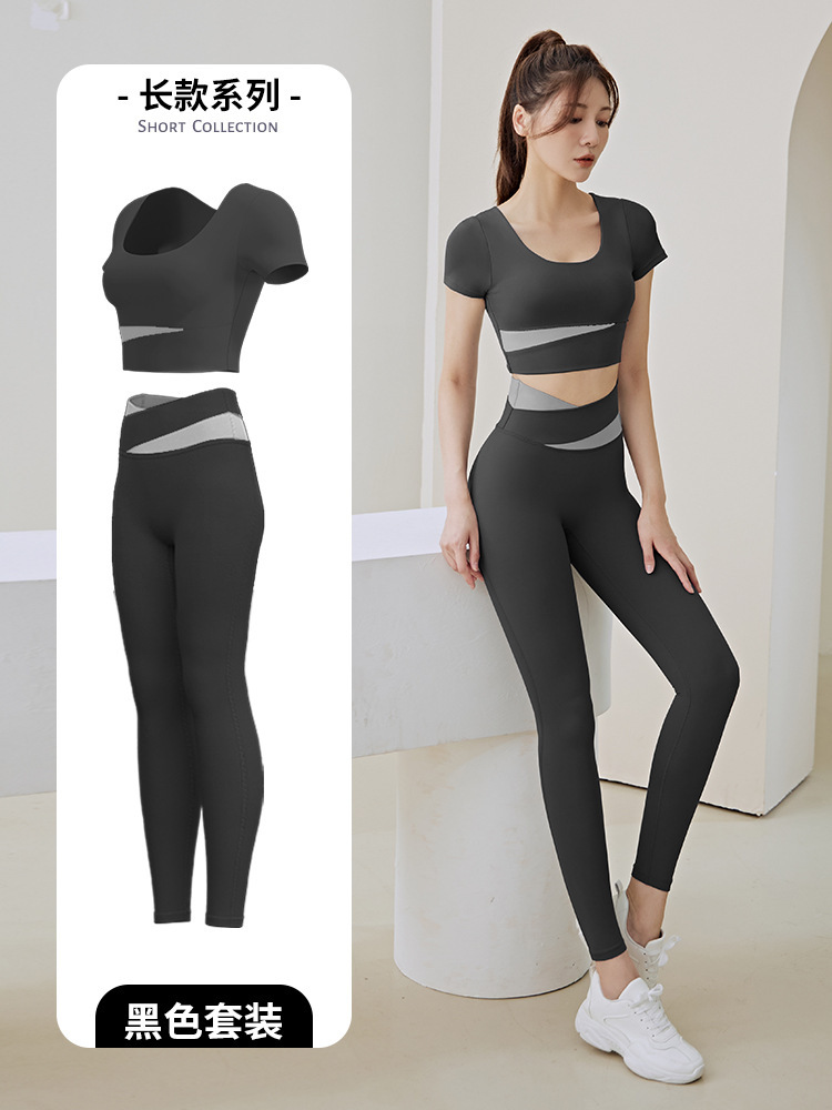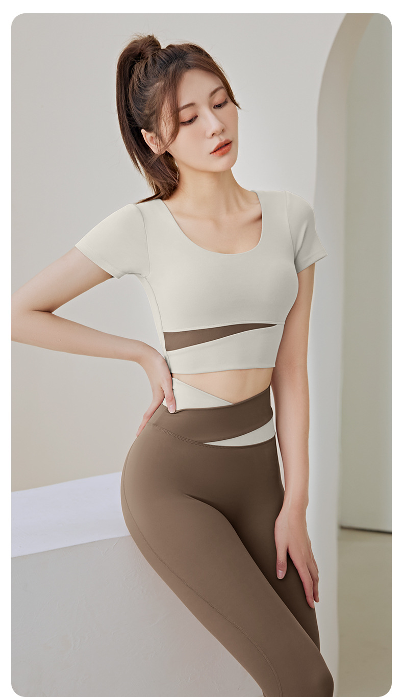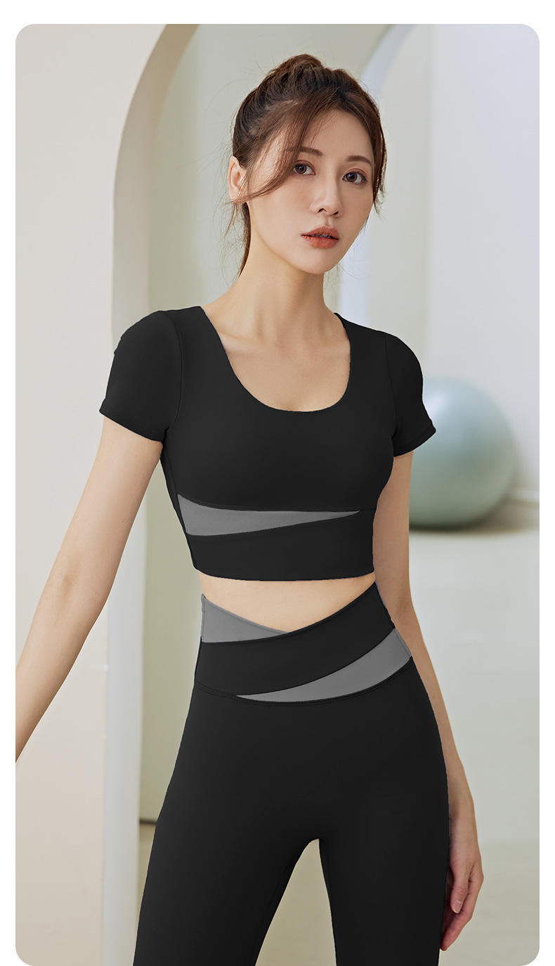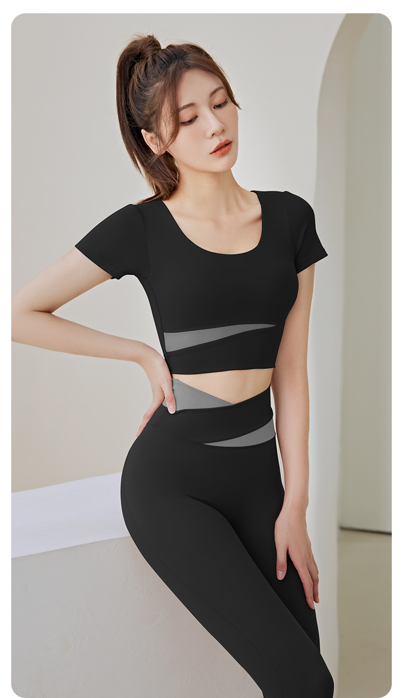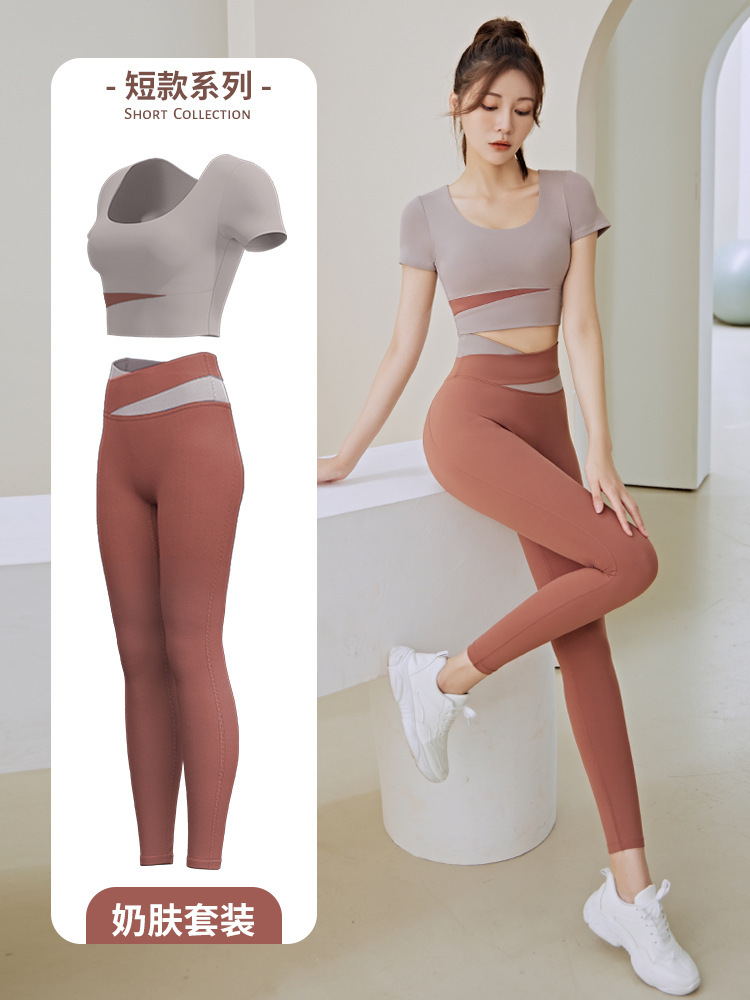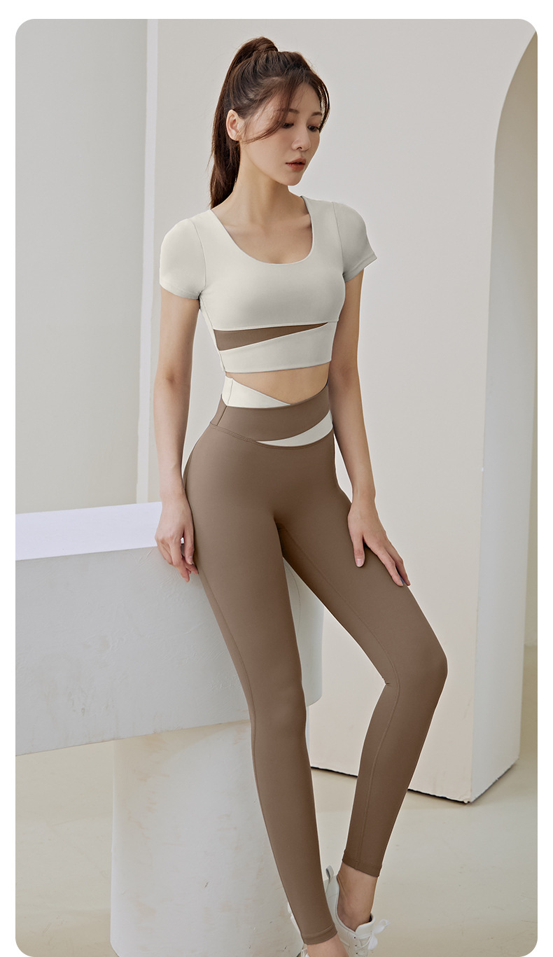 컬러 블록 반팔 요가 세트 여성의 봄과 여름 배꼽 짧은 최고 엉덩이 바지 달리기 스포츠 피트니스 세트