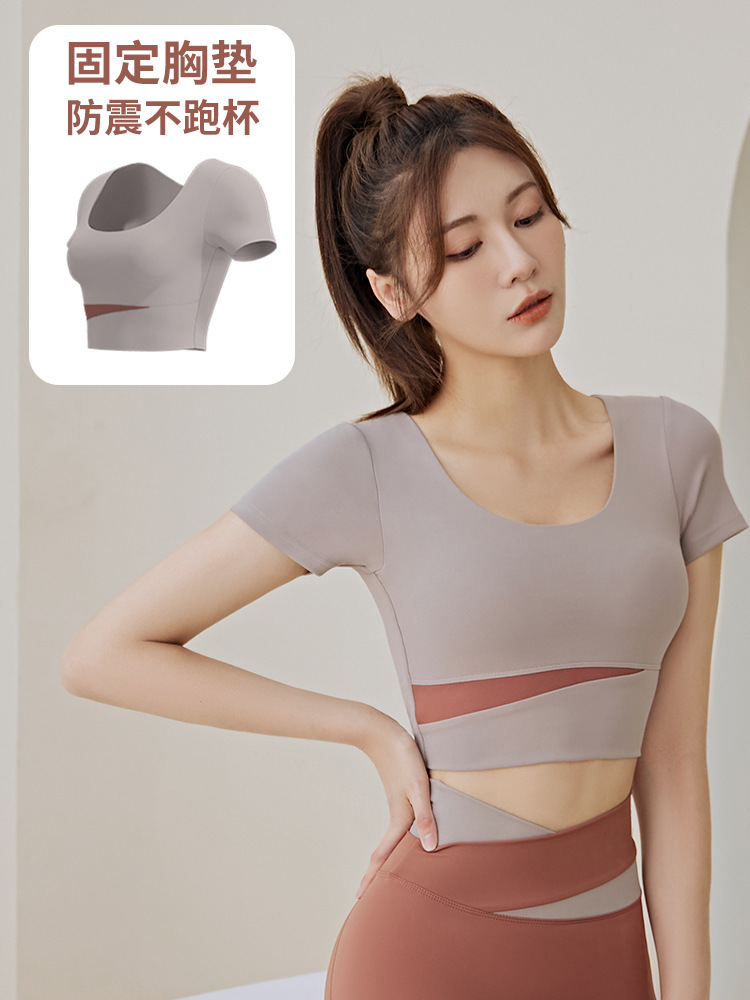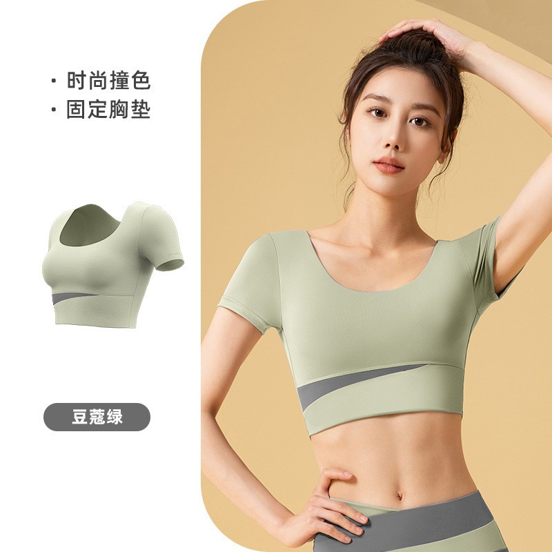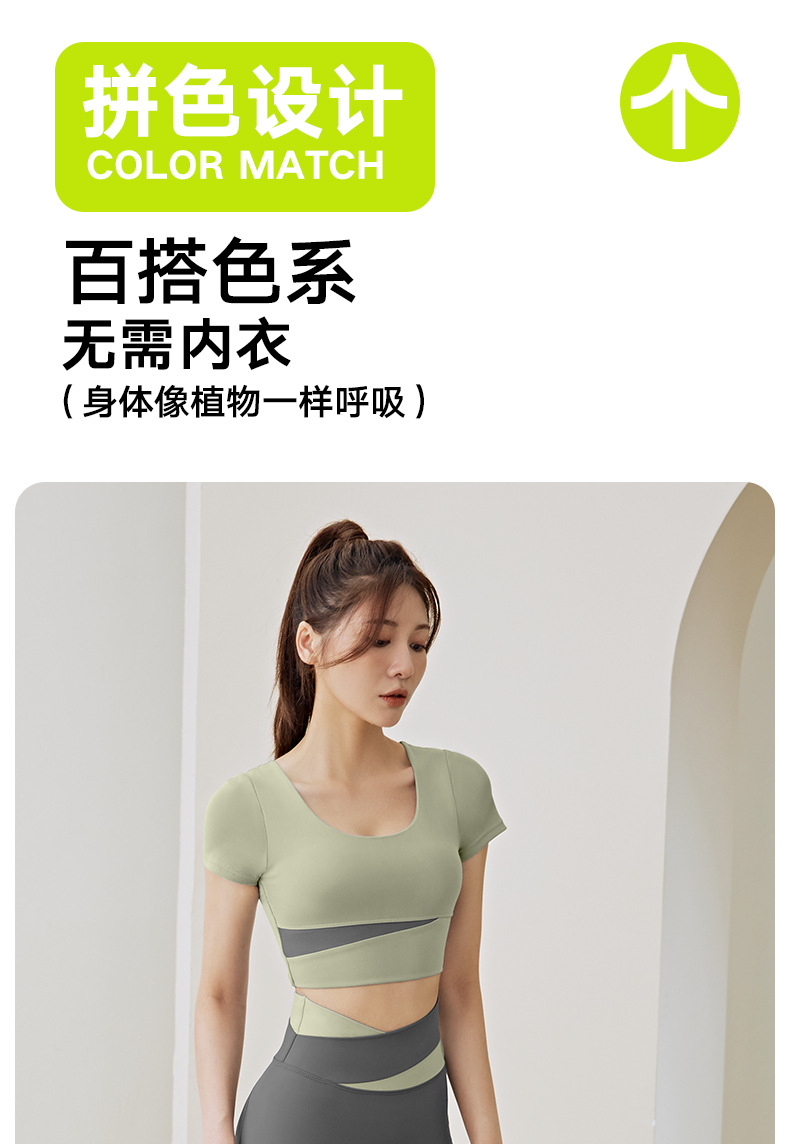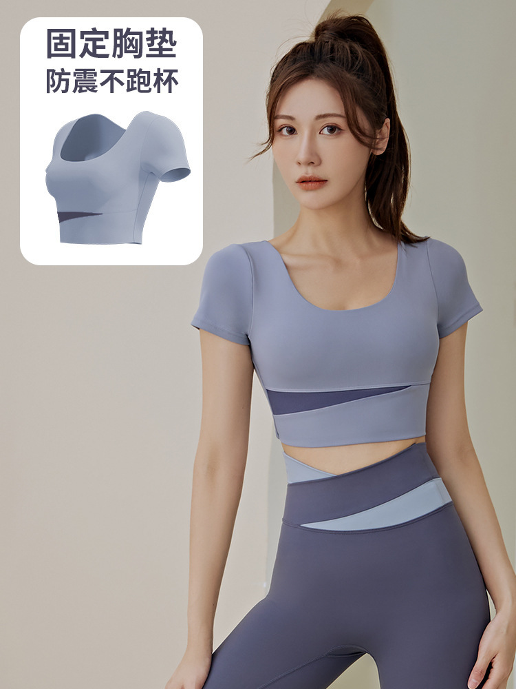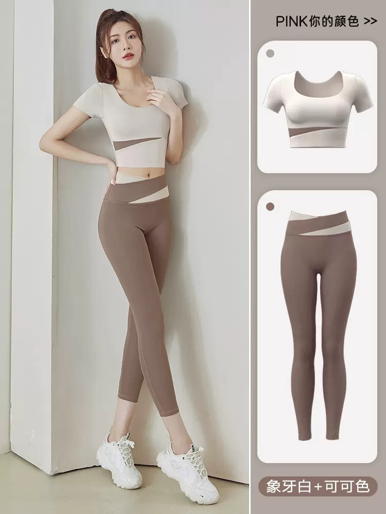 컬러 블록 반팔 요가 세트 여성의 봄과 여름 배꼽 짧은 최고 엉덩이 바지 달리기 스포츠 피트니스 세트스토어 가기