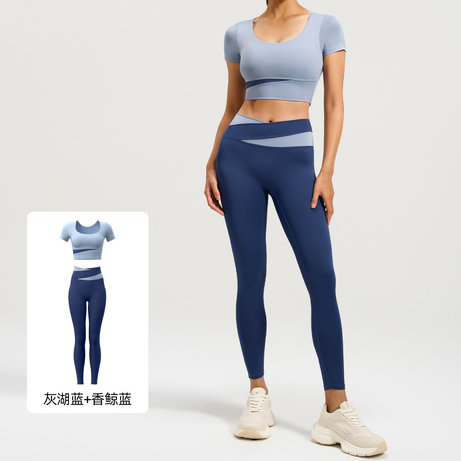 Juyitang 컬러블록 반팔 요가복 세트 여성용 봄여름 힙업 팬츠 러닝 스포츠 트레이닝 피트니스복