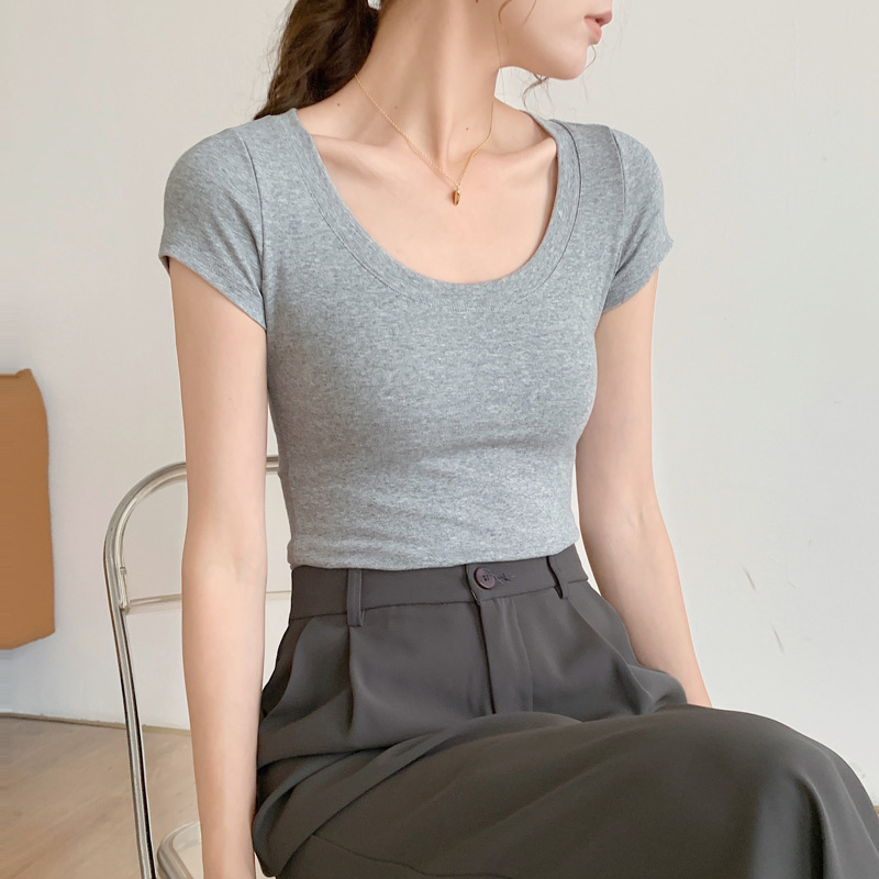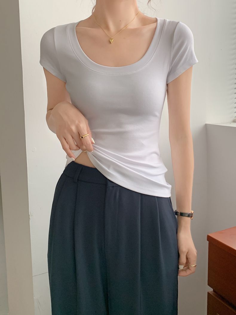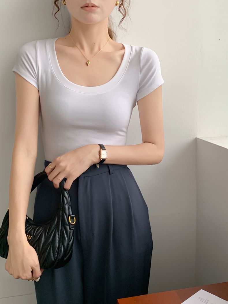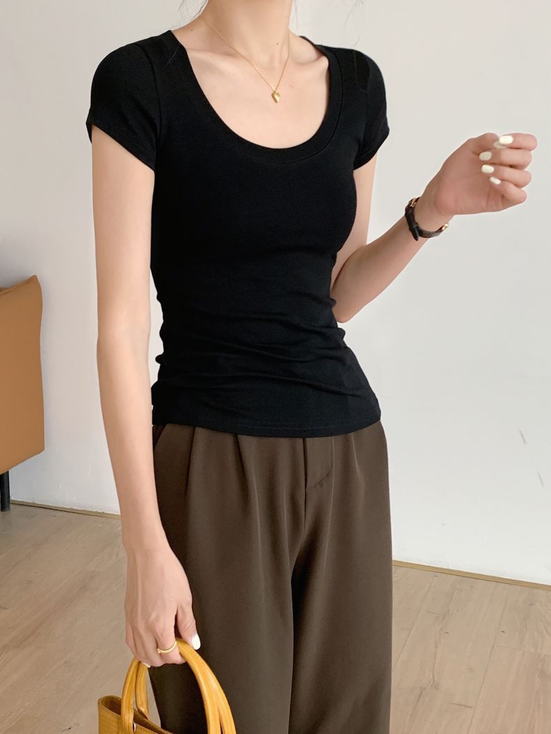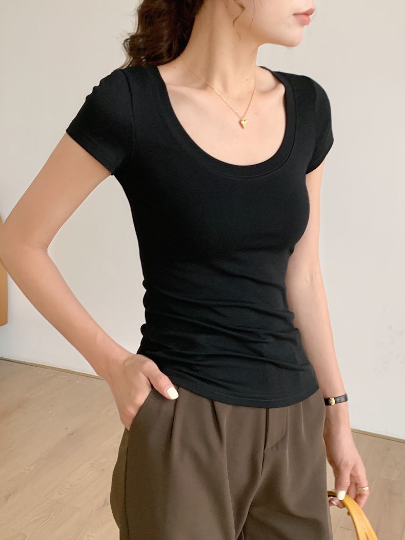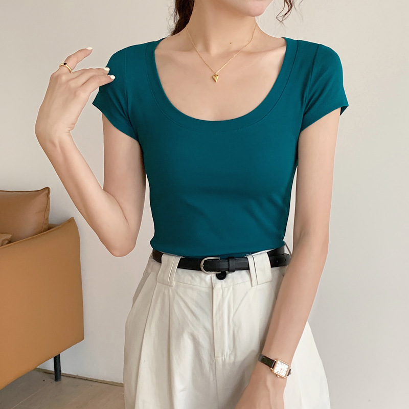 고품질 순수 코튼 티셔츠 여성 반팔 슬림 라운드 넥 섹시 타이트 2025 뉴 여름 탑 솔리드 컬러 바닥 셔츠스토어 가기