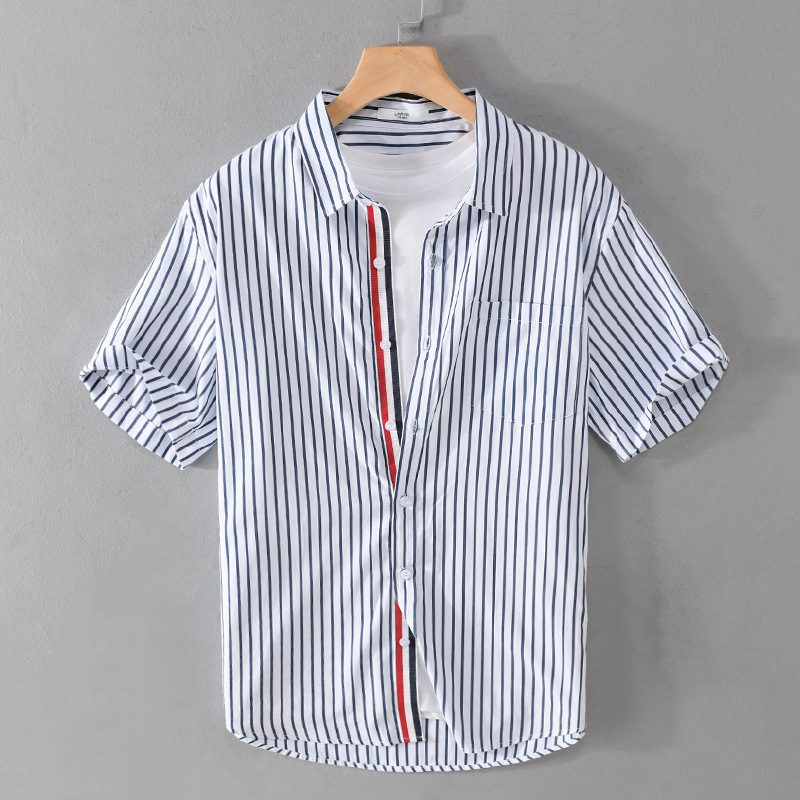 여름 스트라이프 남성용 반팔 셔츠 유행 캐주얼 느슨한 젊은 사람들의 잘 생긴 예술적 남성 셔츠 331스토어 가기