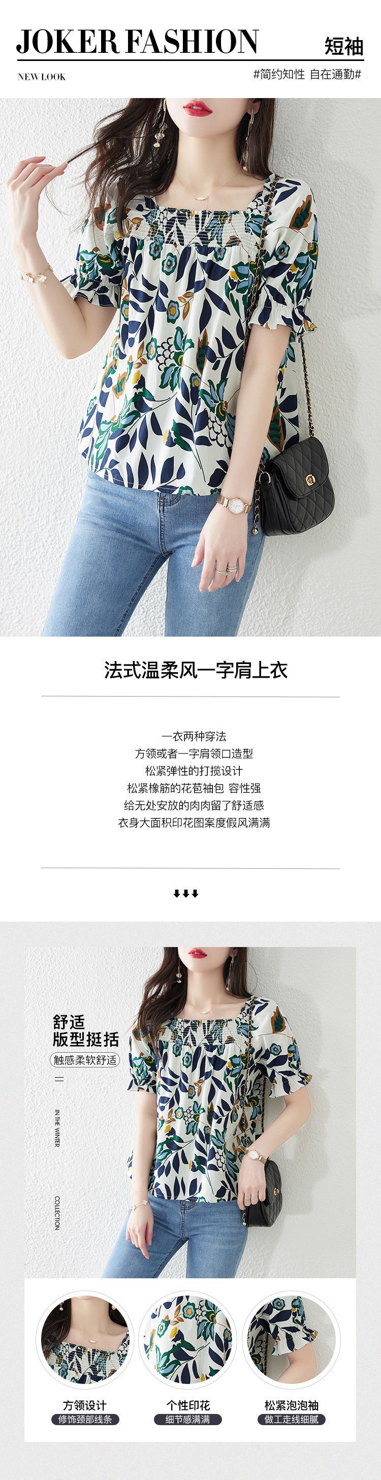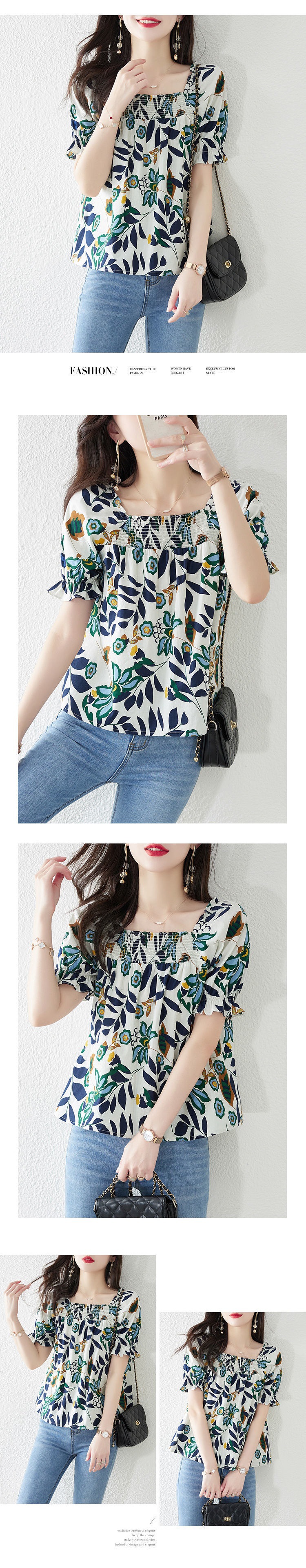 스퀘어 넥 쉬폰 셔츠 여름 2022 새로운 한국 스타일 짧은 느슨한 배꼽 덮는 반팔 꽃 셔츠 탑 여성용스토어 가기