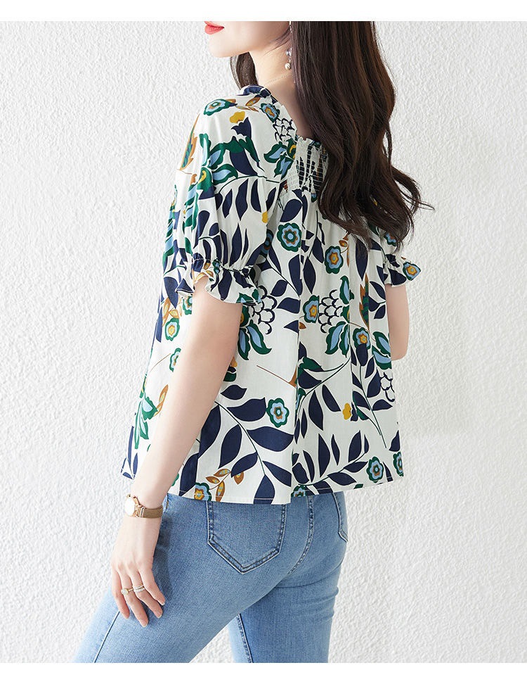 스퀘어 넥 쉬폰 셔츠 여름 2022 새로운 한국 스타일 짧은 느슨한 배꼽 덮는 반팔 꽃 셔츠 탑 여성용