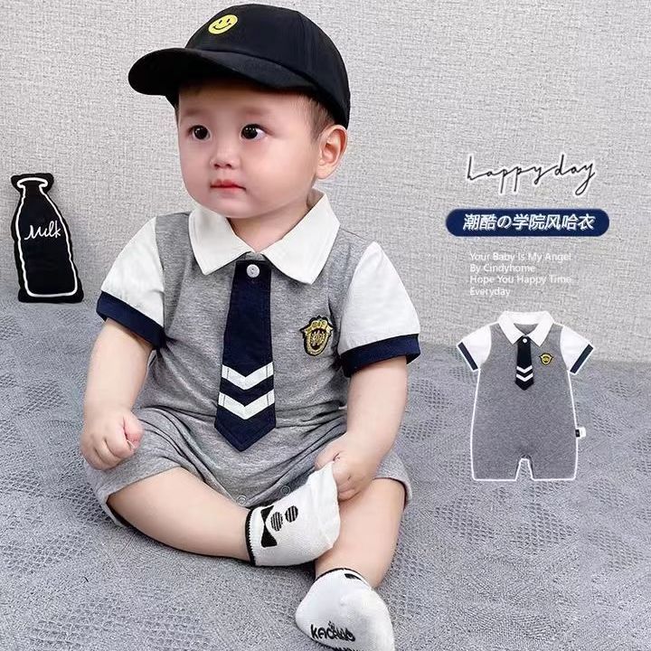 유아 여름 슈퍼 외국 스타일 아기 소년과 소녀를위한 한국 스타일 대학 스타일 점프 슈트 잘 생긴 반팔 신사 스타일 크롤링 패션스토어 가기