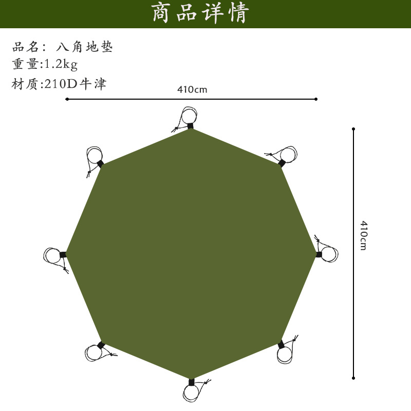 此款主要是为八角帐篷设计底布,通过耐磨牛津布和高防水压,以保护帐篷底布不被刺穿,同时提高帐篷的防潮,使八角帐篷使用跟放心安全。