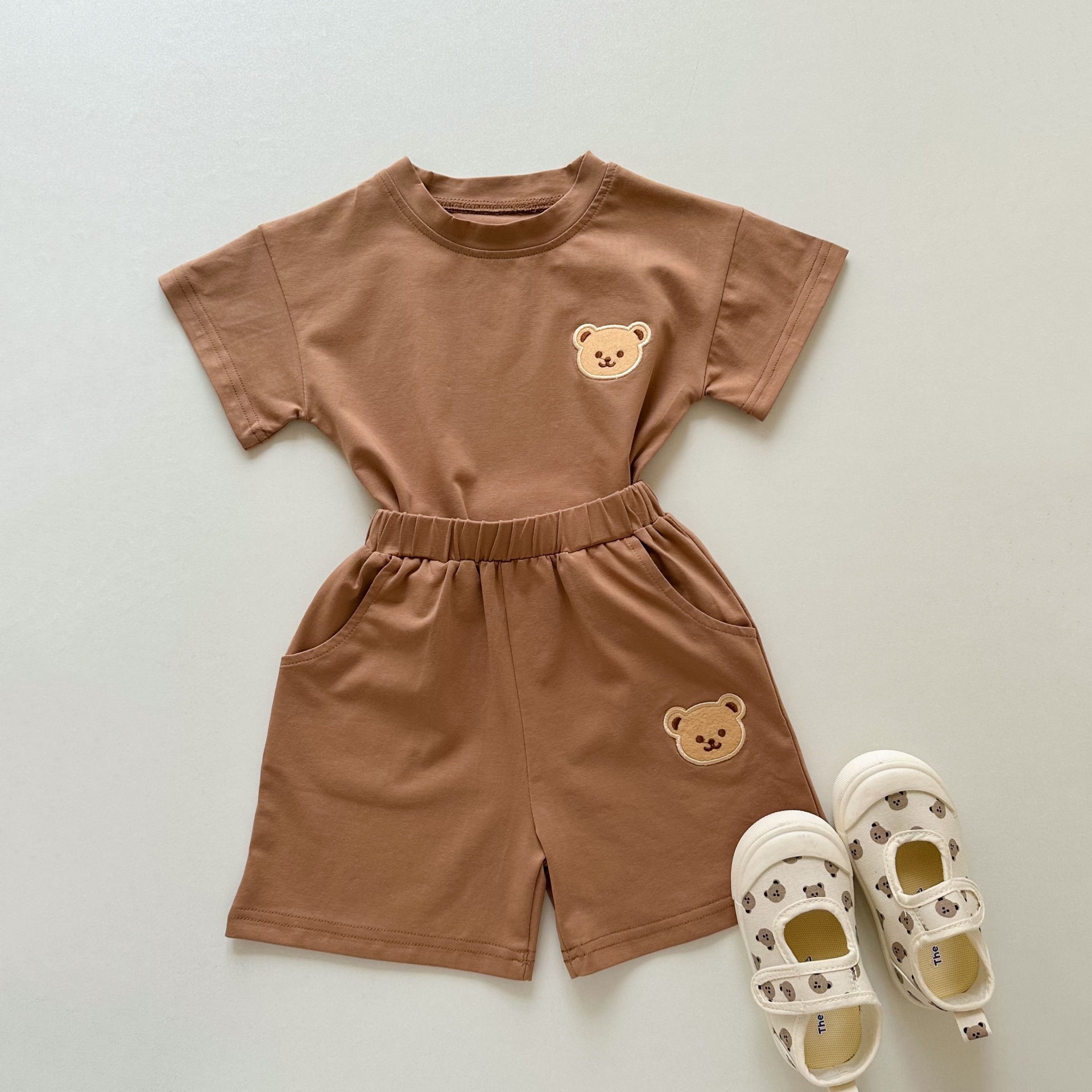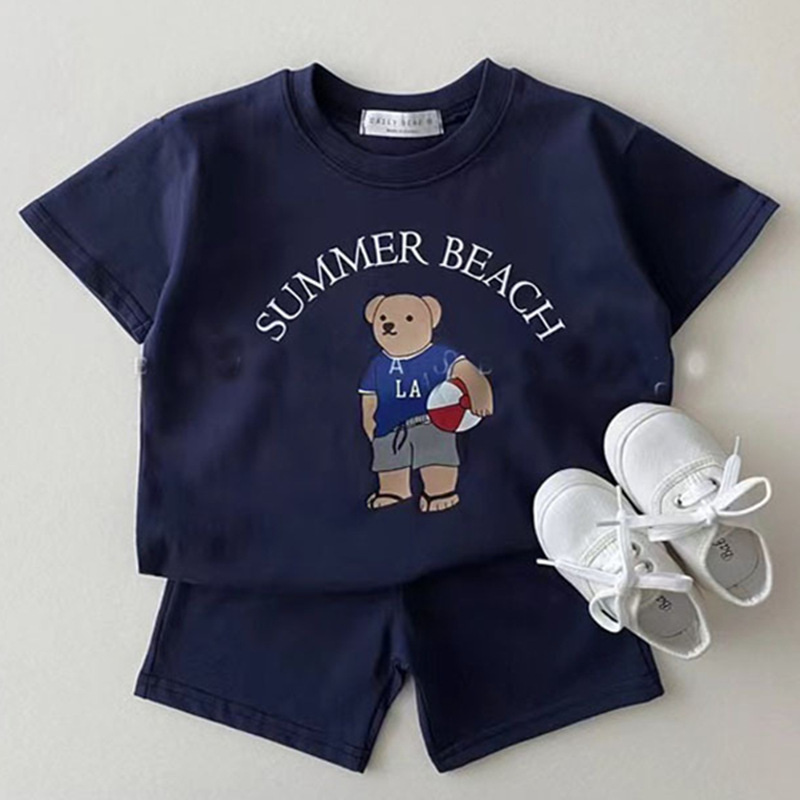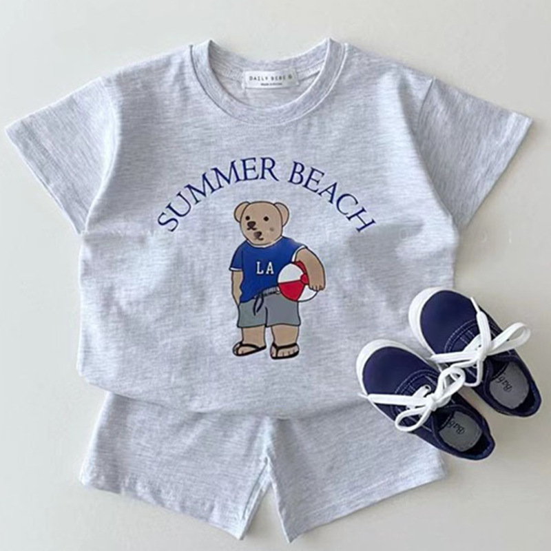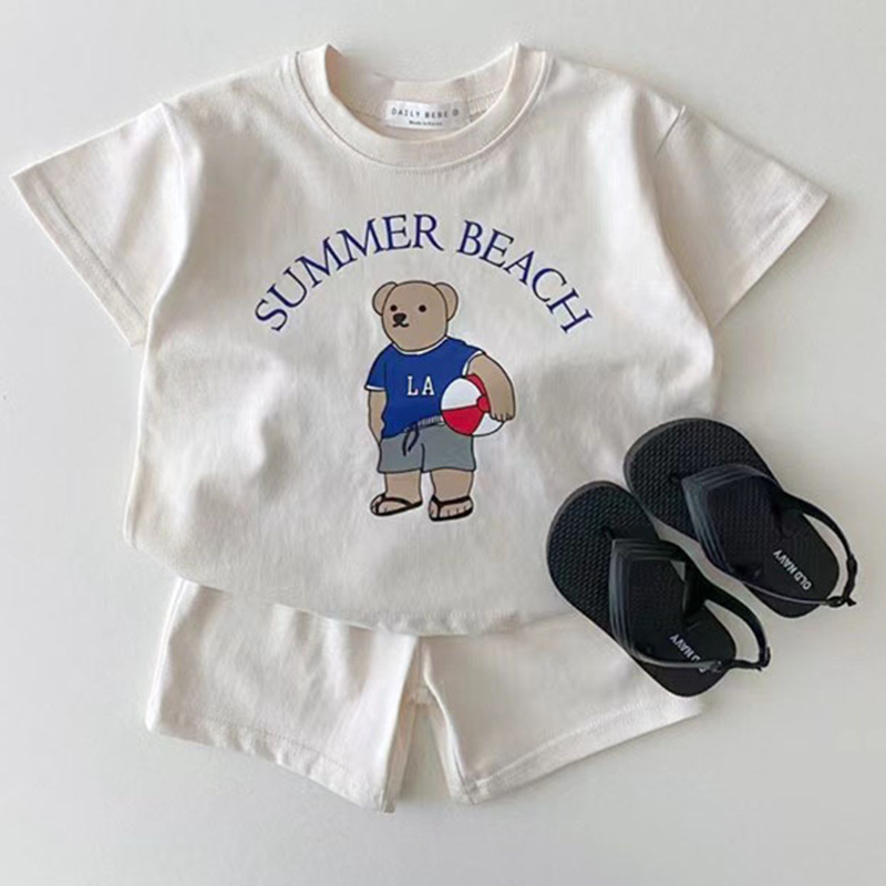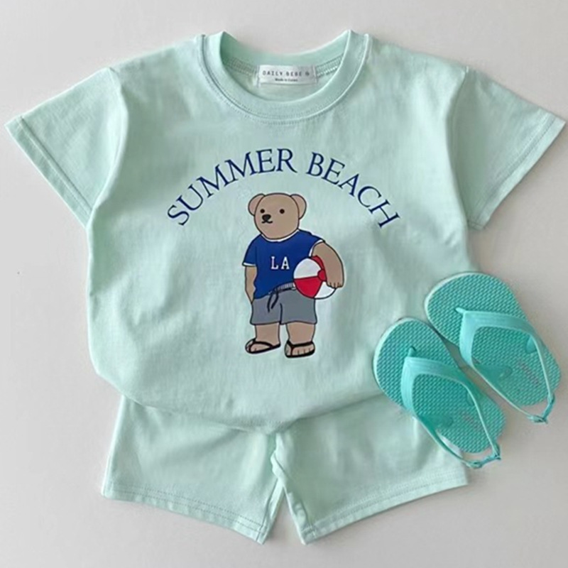 한국 스타일 반팔 투피스 세트 여름 순면 티셔츠 소년 소녀 아기 귀여운 만화 아동복 반바지 아기 옷스토어 가기