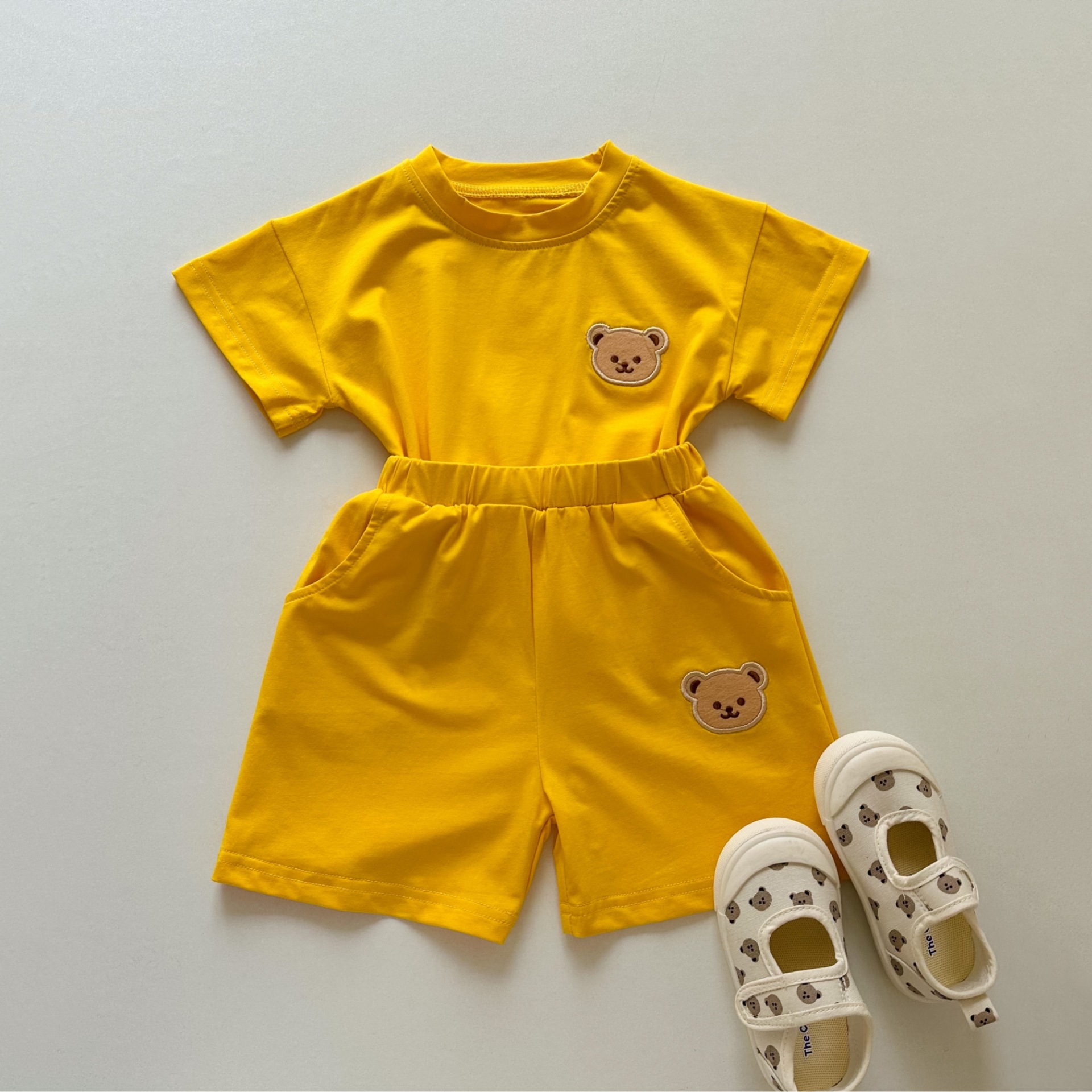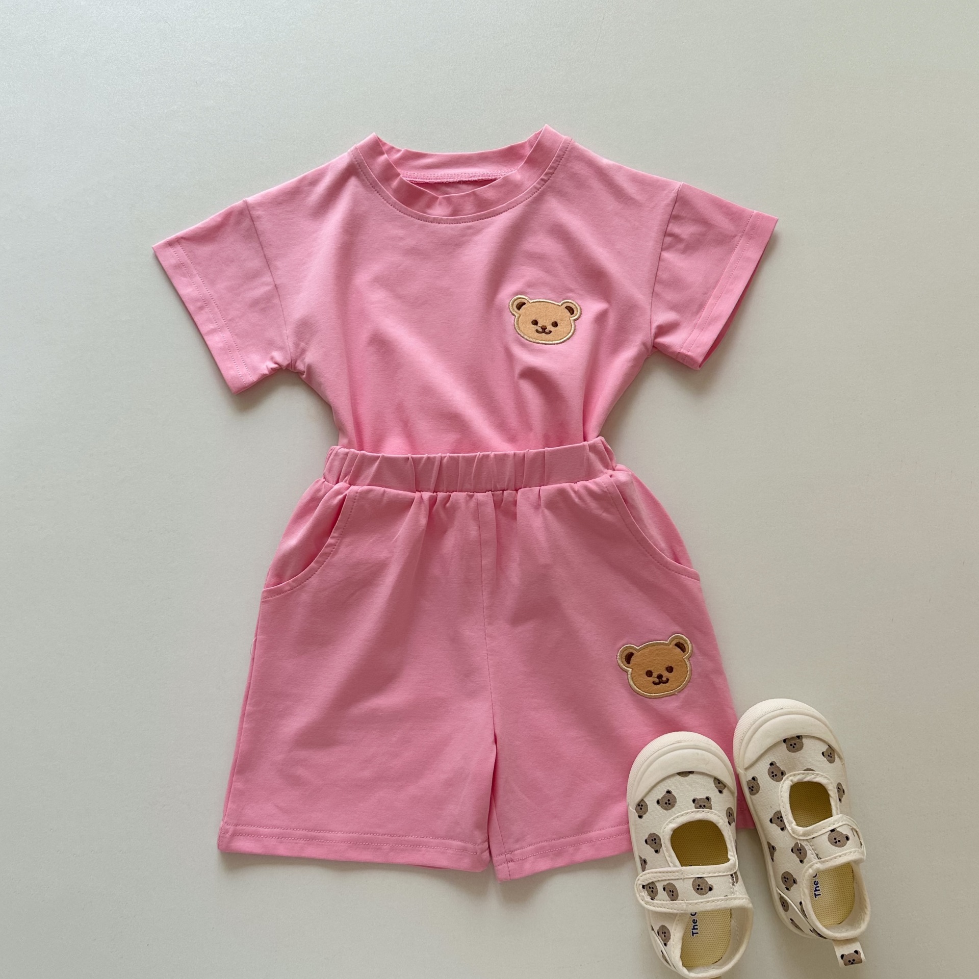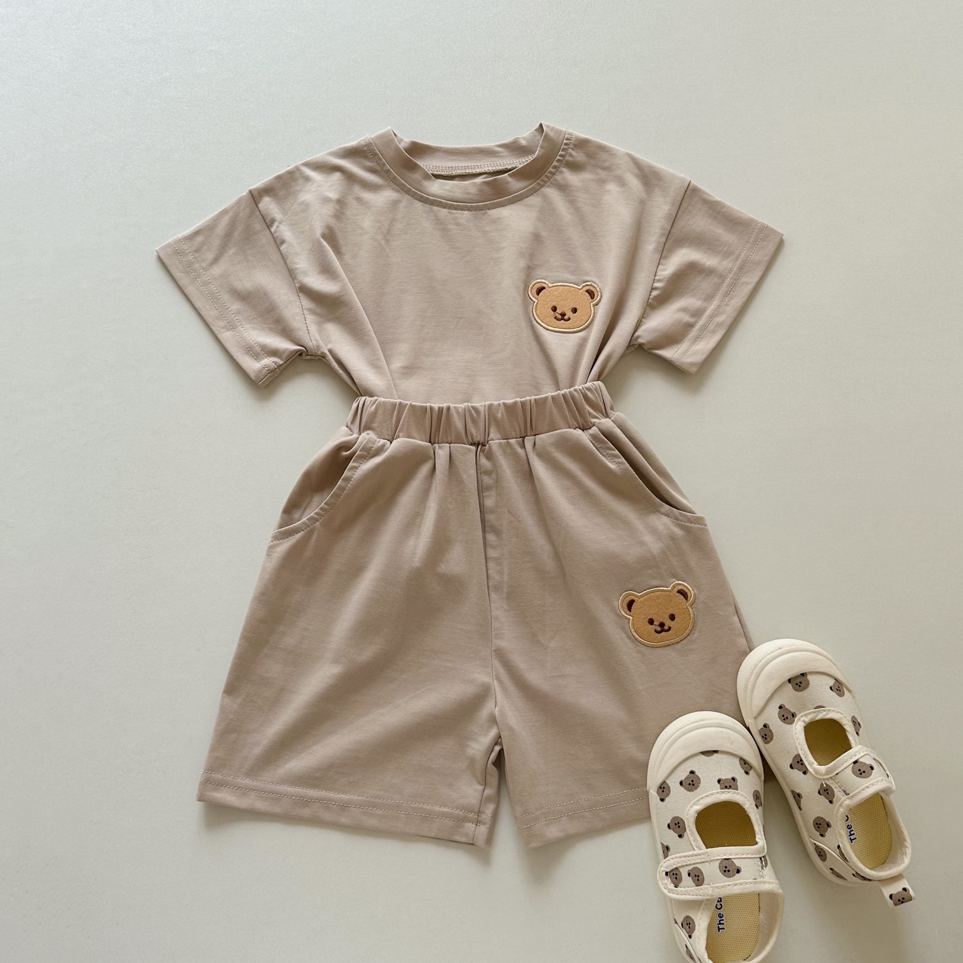 한국 스타일 반팔 투피스 세트 여름 순면 티셔츠 소년 소녀 아기 귀여운 만화 아동복 반바지 아기 옷스토어 가기