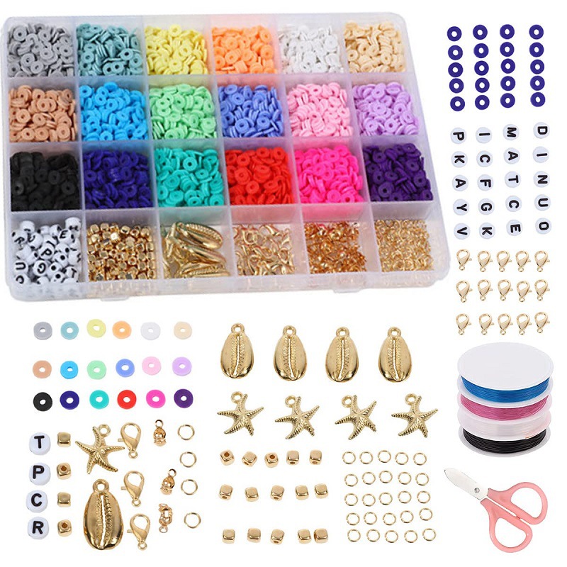 产品明细: 4800 颗粘土珠(18 颗明亮的颜色/200 颗)、50 颗字母珠和心形珠子、10 颗吊坠、100 颗方形珠子、50 个带扣、20 套龙虾扣、100 颗开口环。 4卷10米长的松紧带和1把剪刀