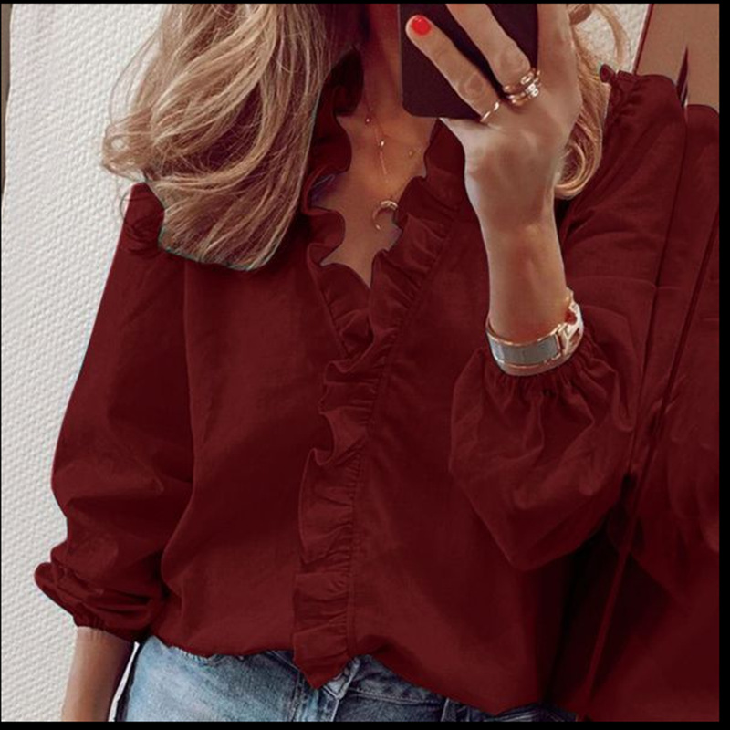 2023夏季亚马逊独立站欧美新款长袖荷叶边衬衫大码女装上衣T恤