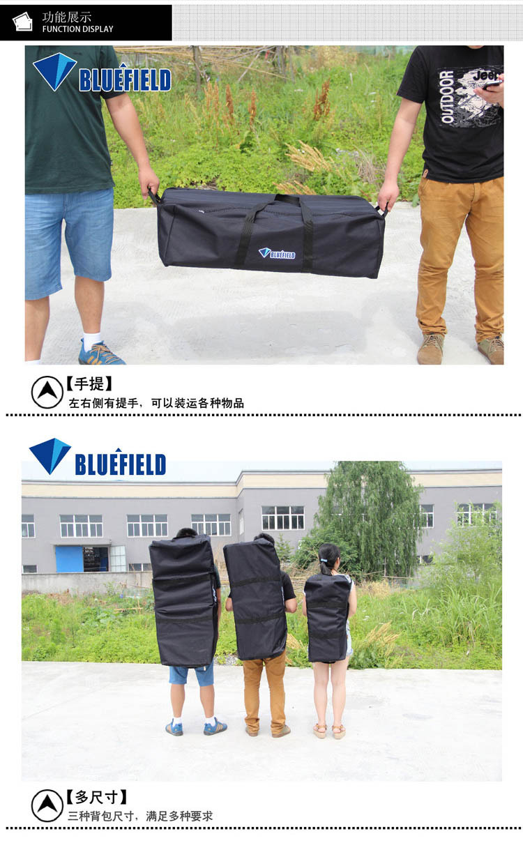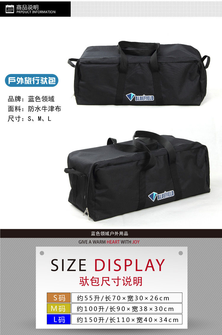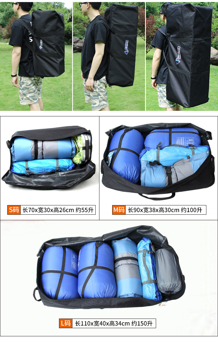 L码150升,可装4人帐篷*1+单人睡袋*3+气垫*3+防潮垫*1