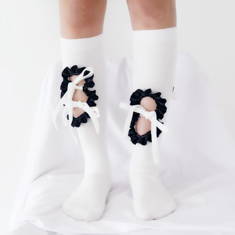 불규칙한 종아리 양말 레이스 업 중공 틈새 디자인 감각 흑백 3 홀 중반 종아리 길이 양말 면 개성 패션 양말스토어 가기