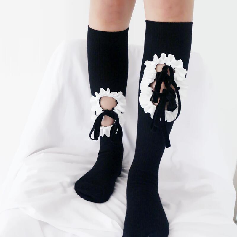 불규칙한 종아리 양말 레이스 업 중공 틈새 디자인 감각 흑백 3 홀 중반 종아리 길이 양말 면 개성 패션 양말