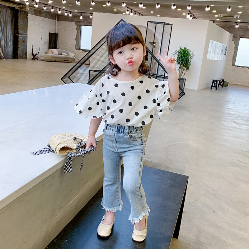 여름 소녀 세트 아기 온라인 인기있는 외국 스타일 어린이 개인 유행 브랜드 한국 스타일 물방울 무늬 쉬폰 셔츠 데님 플레어 바지스토어 가기