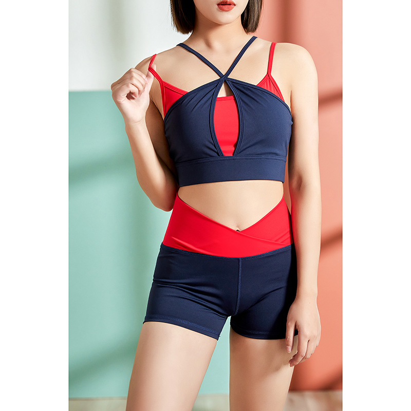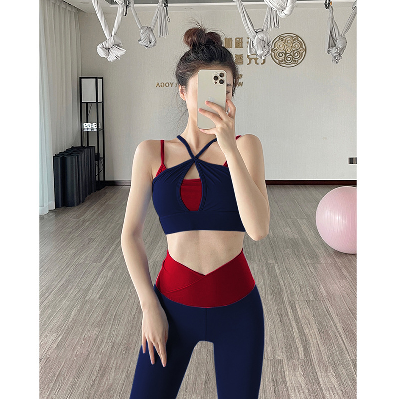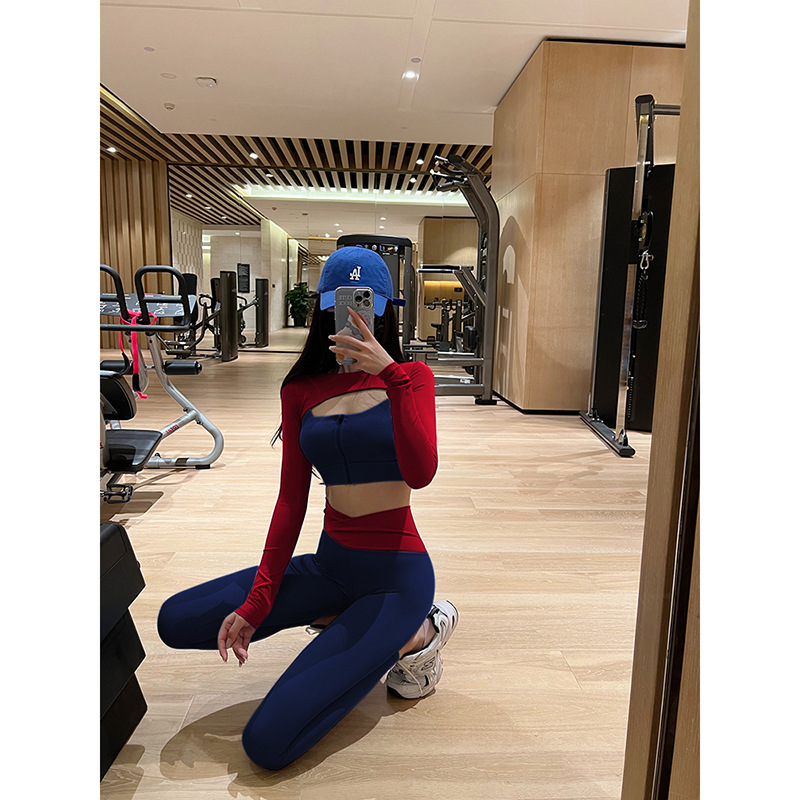 색상 대비 요가 세트 3 종 세트 여름 새로운 긴팔 탑 조끼 탄성 엉덩이 바지 전문 속건 피트니스 착용스토어 가기