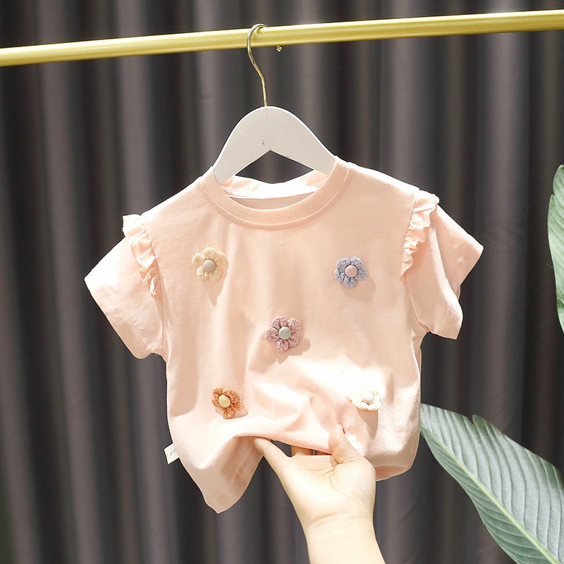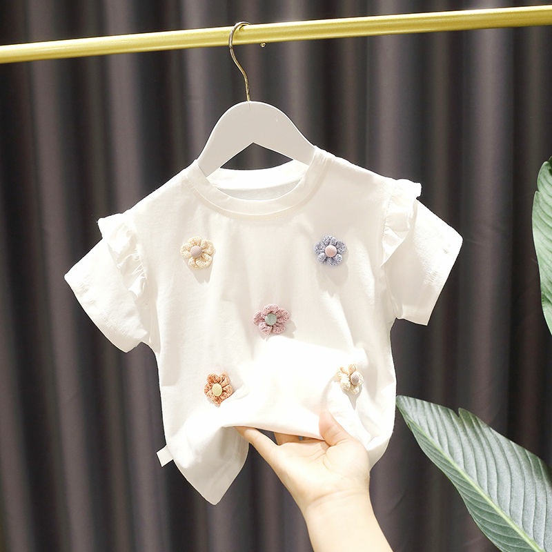 여아 여름 반팔 티셔츠 아기 온라인 인기있는 외국 스타일 어린이의 성격 유행 브랜드 한국 스타일 꽃 비행 소매 신선한 반 소매