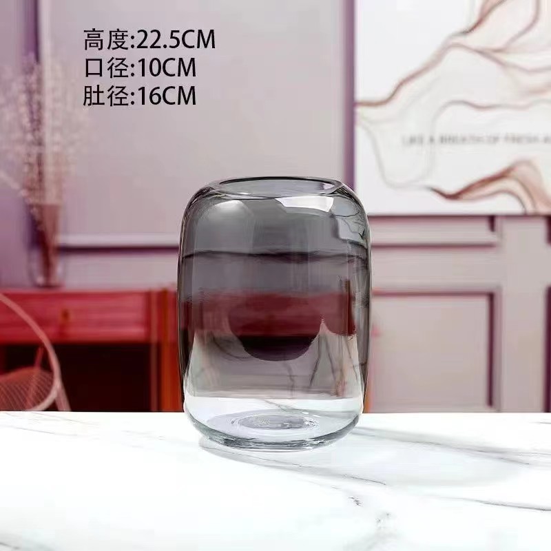 간단한 큰 배꼽 유리 꽃병 연기 회색 거실 바닥 꽃 병 데스크탑 장식 장식품 꽃병 도매