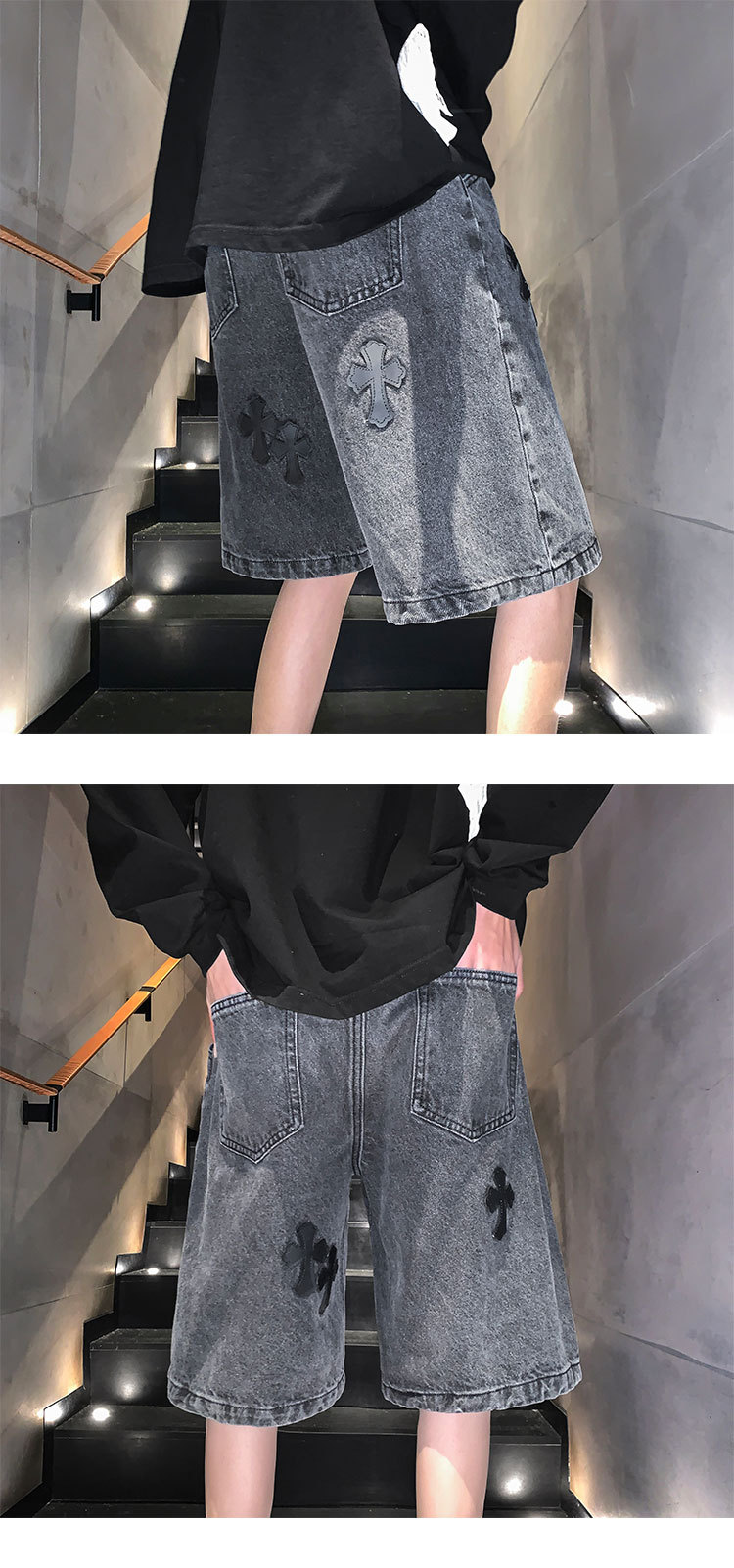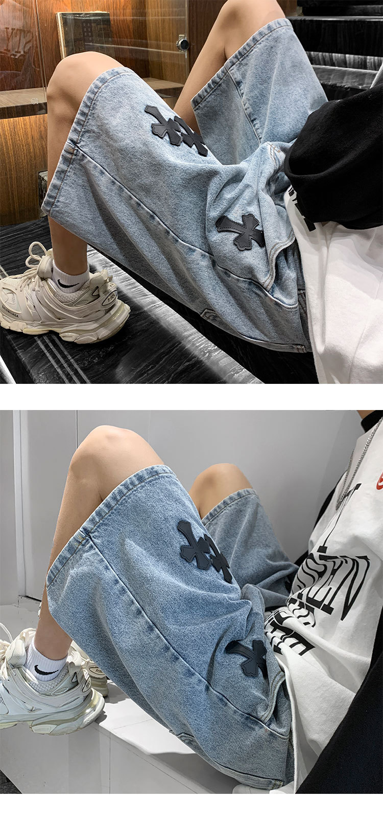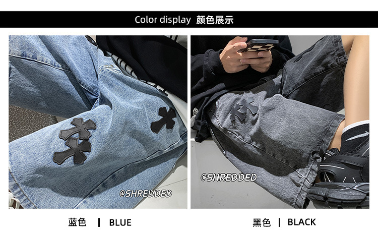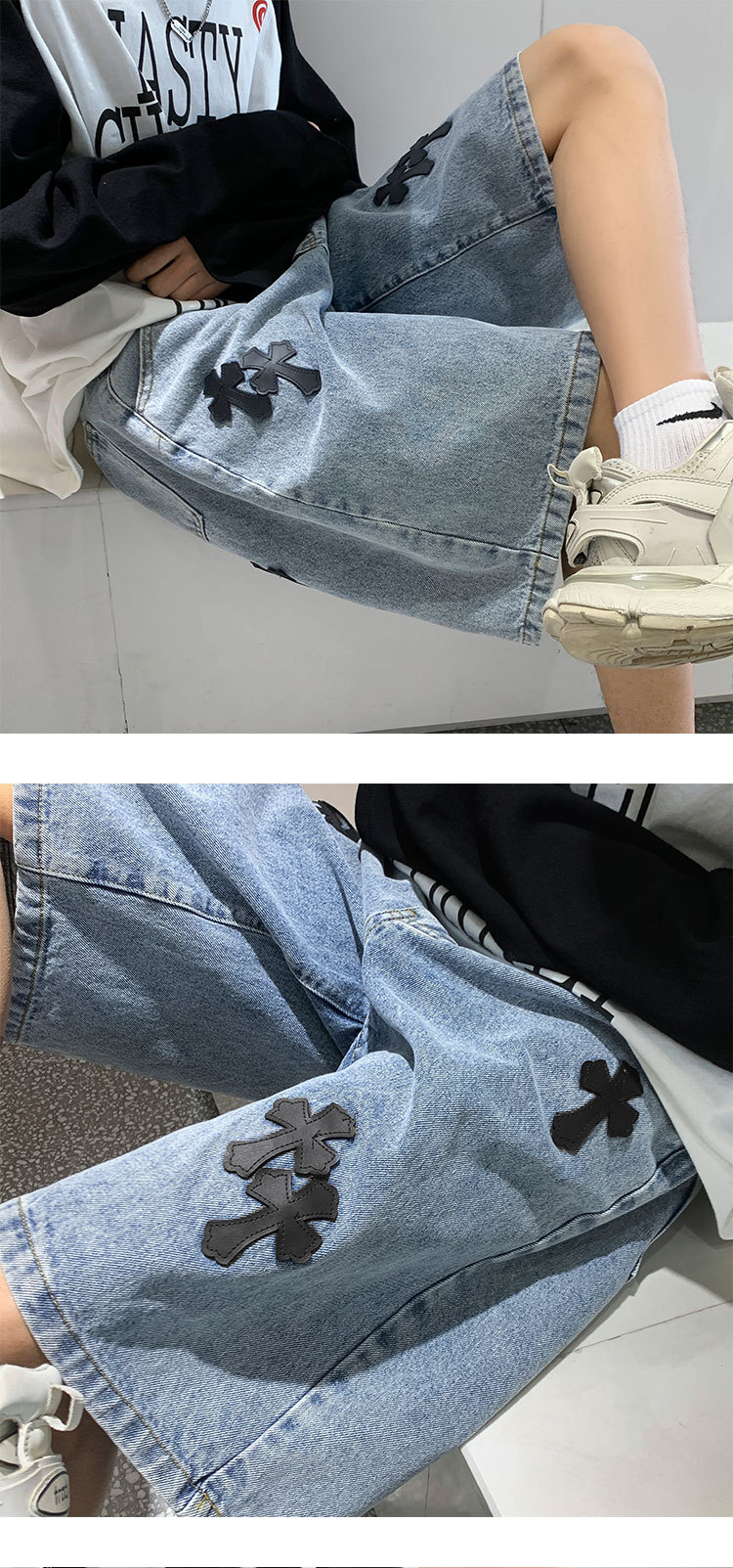 데님 반바지 남자의 여름 홍콩 스타일 새로운 크로스 라벨링 하이 스트리트 십대 느슨한 스트레이트 캐주얼 반바지스토어 가기