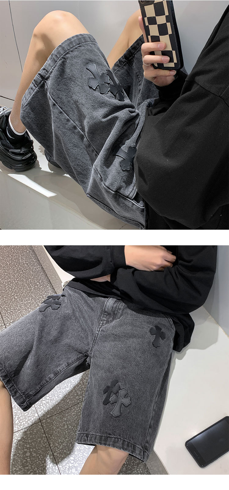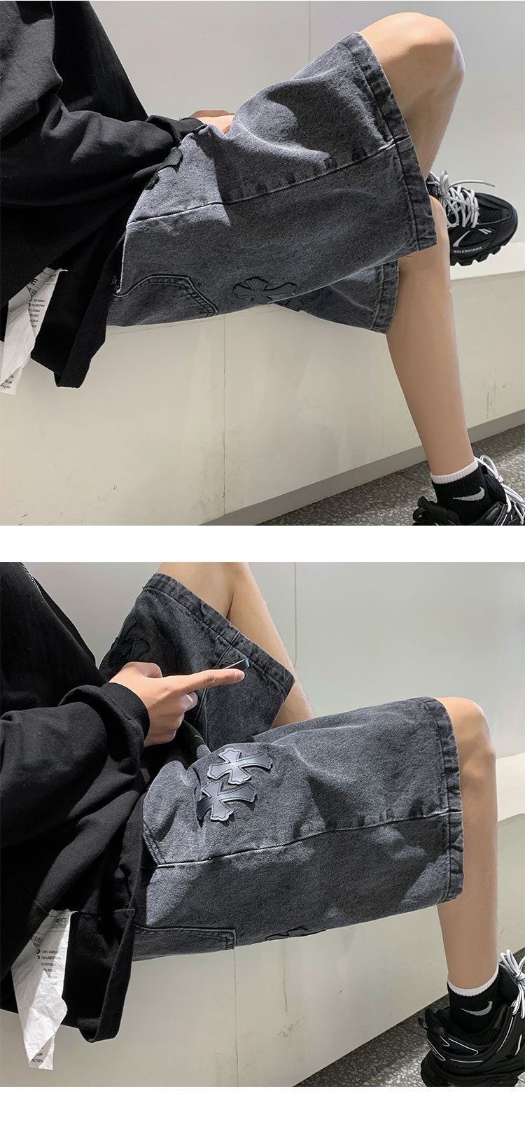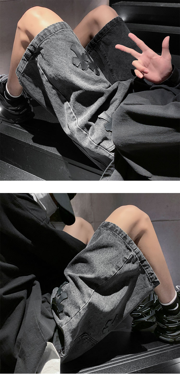 데님 반바지 남자의 여름 홍콩 스타일 새로운 크로스 라벨링 하이 스트리트 십대 느슨한 스트레이트 캐주얼 반바지스토어 가기