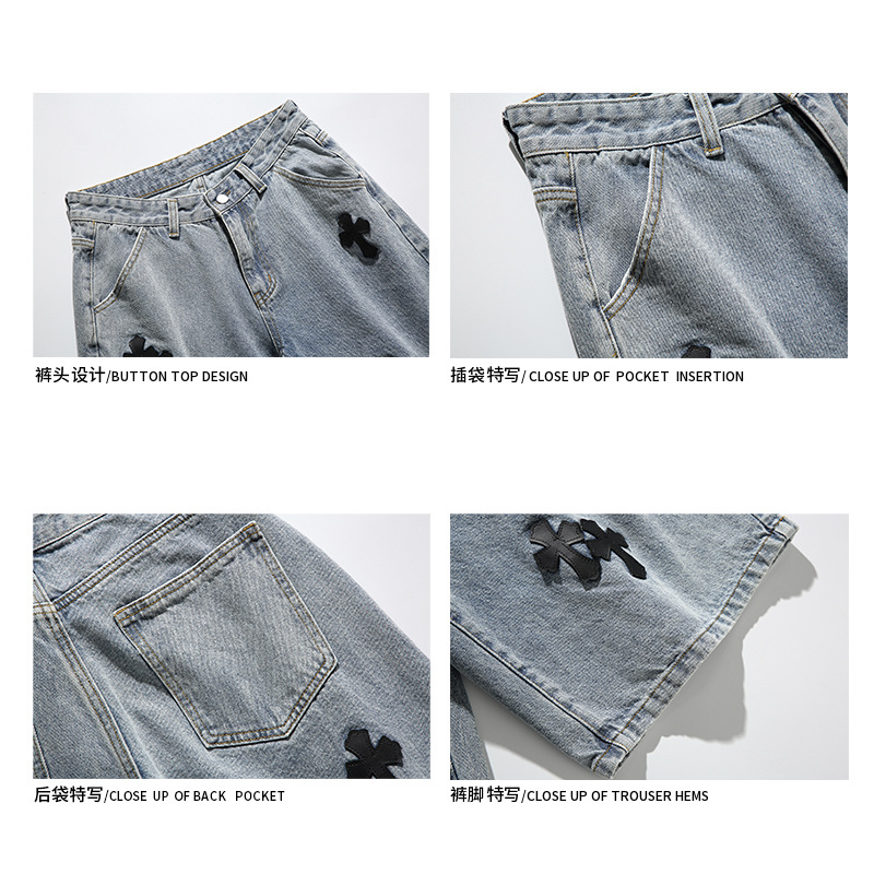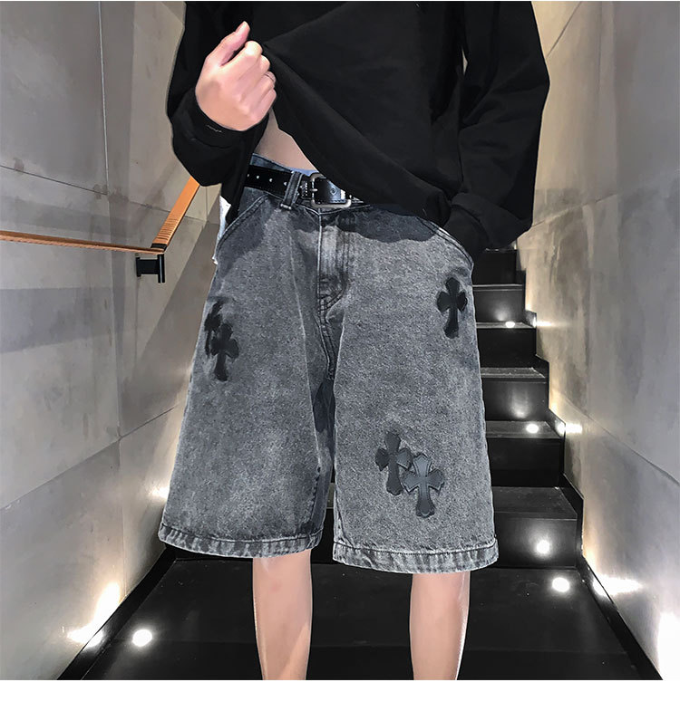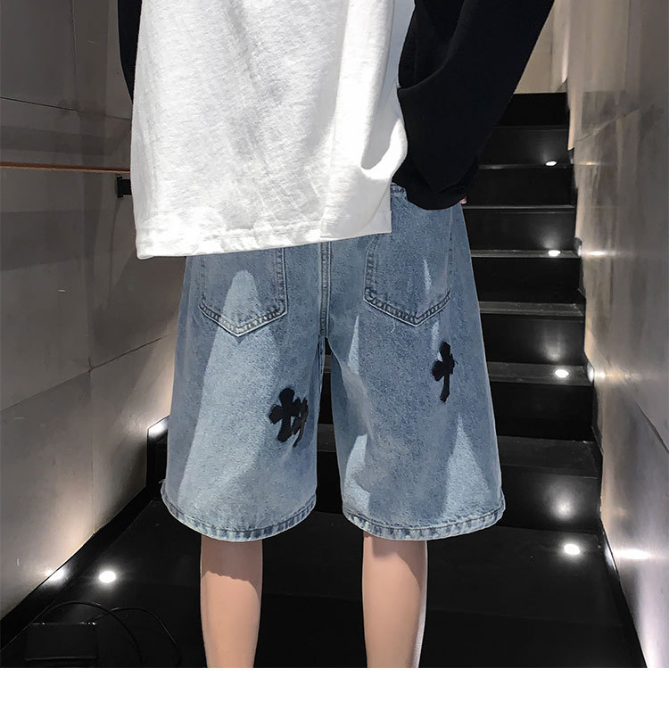데님 반바지 남자의 여름 홍콩 스타일 새로운 크로스 라벨링 하이 스트리트 십대 느슨한 스트레이트 캐주얼 반바지