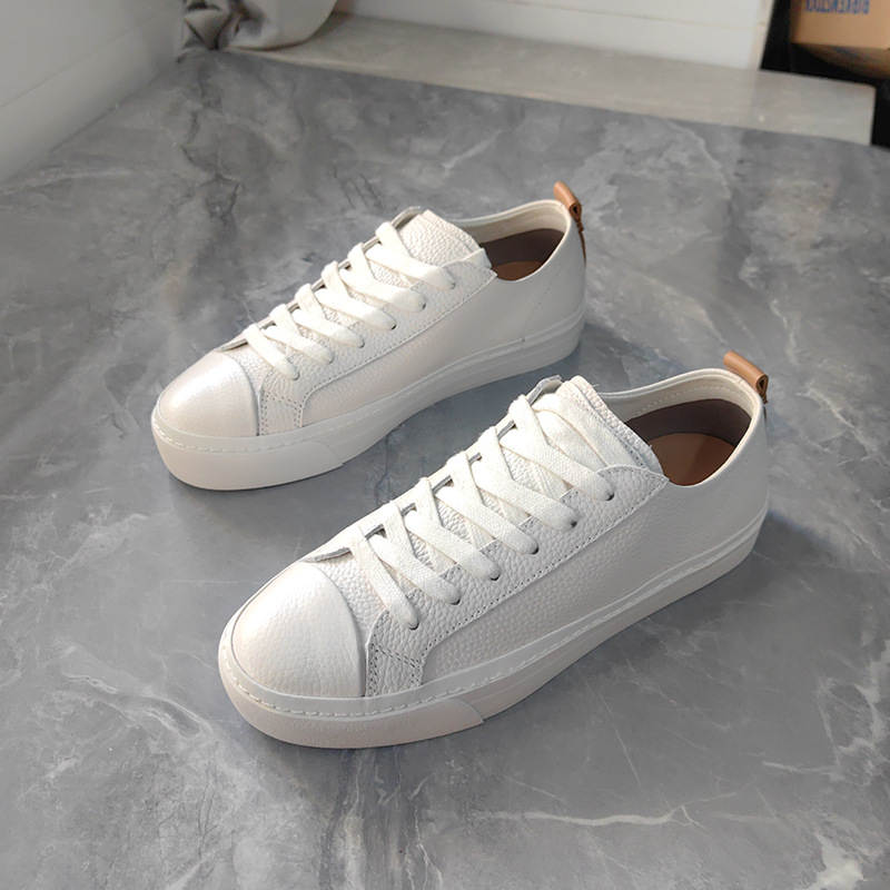 2023 가을 새로운 여성 신발 간단한 복고풍 탑 레이어 소 가죽 라운드 헤드 캐주얼 레이스 업 플랫 컬러 매칭 작은 흰색 신발