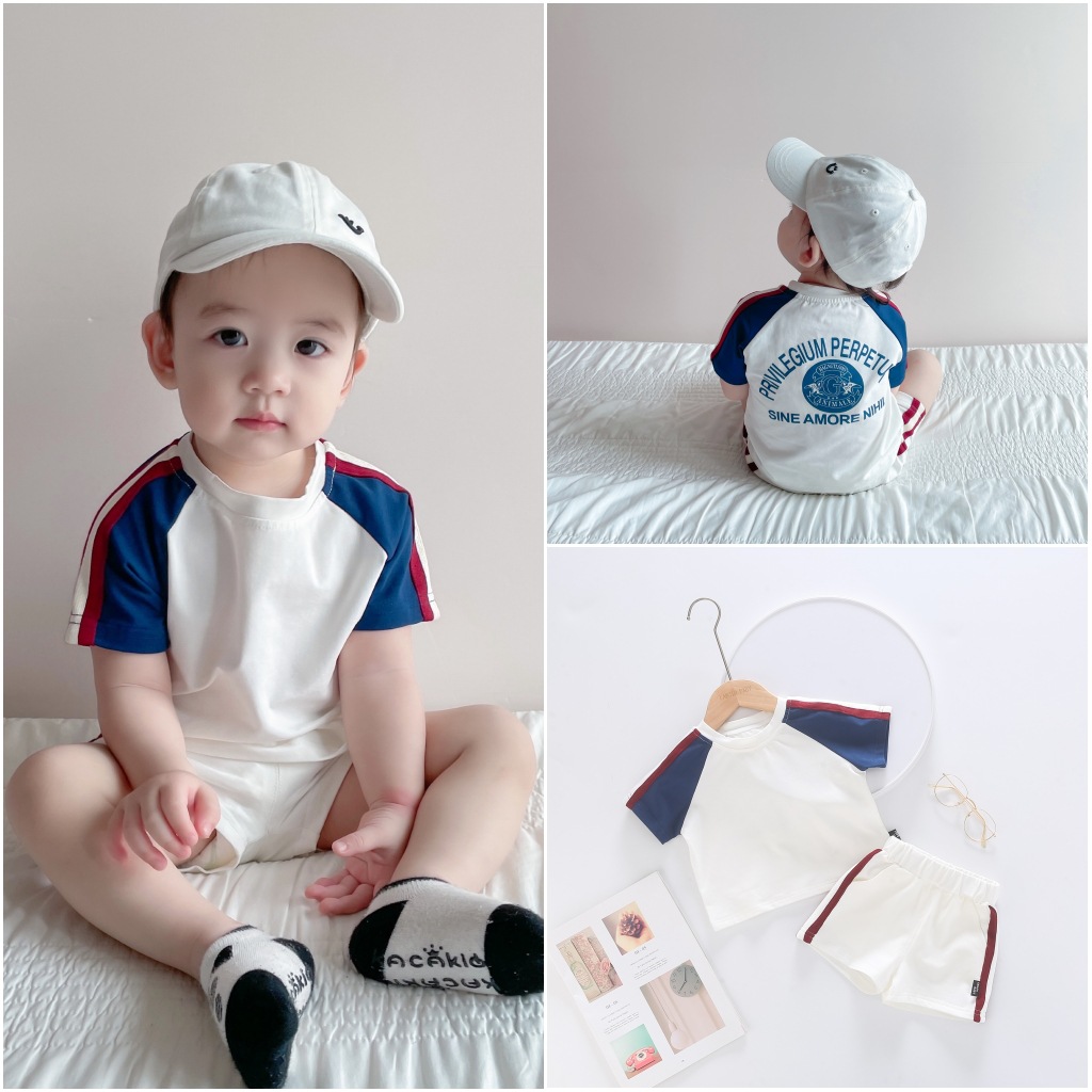 ins 유아 한국 스타일 아동복 2025 여름 남성과 여성 베이비 반팔 반바지 정장 아동 컬러 블록 2 피스 세트 유행스토어 가기