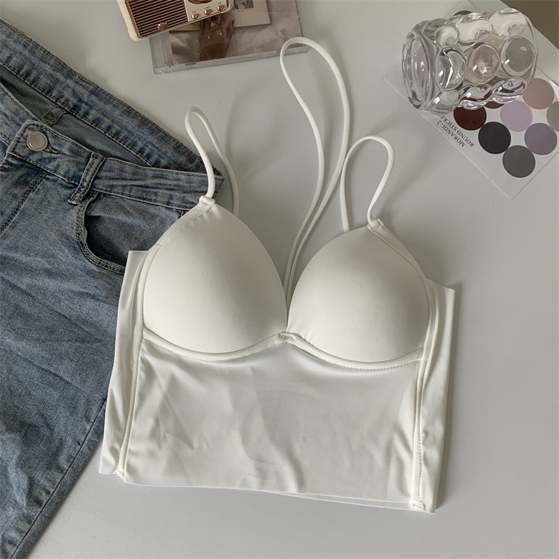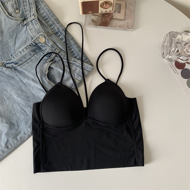 새로운 아이스 실크 원활한 교수형 목 딥 V 얇은 섹시한 여름 아름다운 등 속옷 한 컵 포장 가슴 캐미솔 조끼 여성용스토어 가기