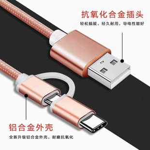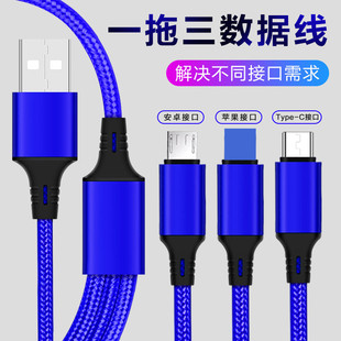 usb线 尼龙编织一拖三数据线 适用二合一typec苹果安卓充电线批发
