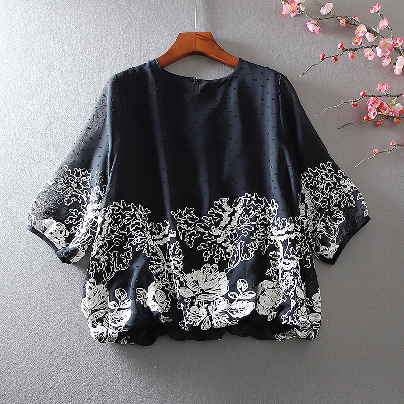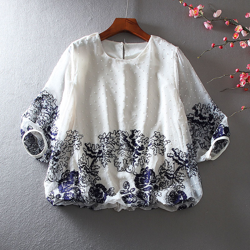 여름 복고풍 패션 예술적 기질 슬림 쉬폰 느슨한 편안한 비 다림질 드레이핑 자수 셔츠 탑 에이전트