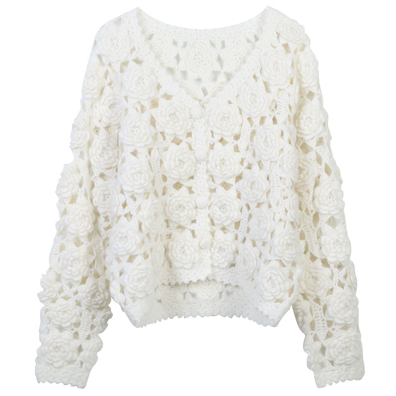 프랑스 스타일 봄과 여름 니트 가디건 단색 핸드 후크 입체 장미 중공 디자인 우아한 사교계 V-넥 긴 소매 탑
