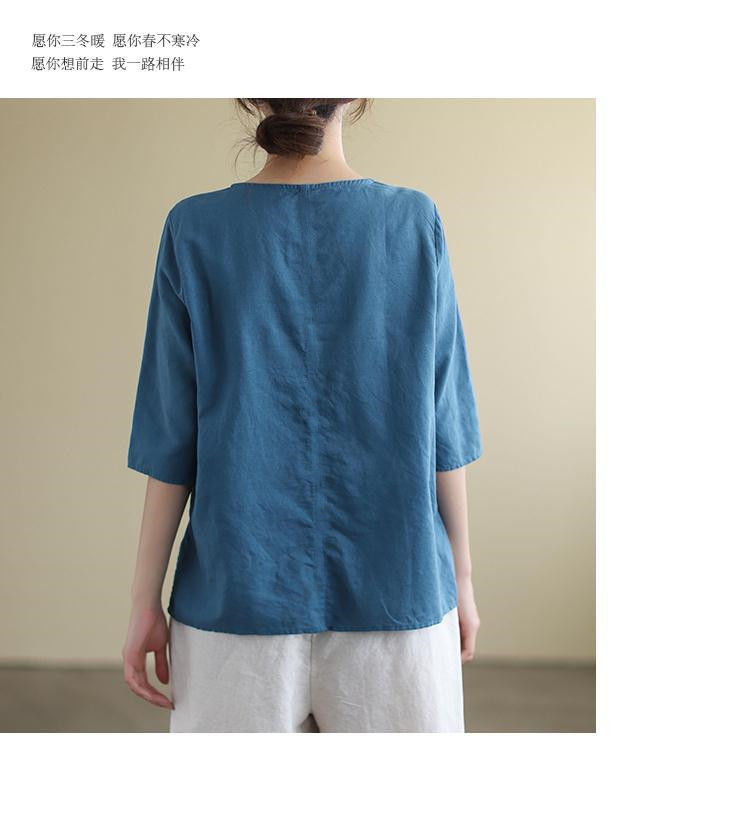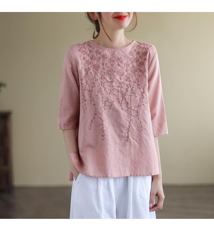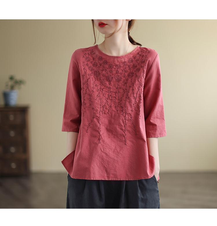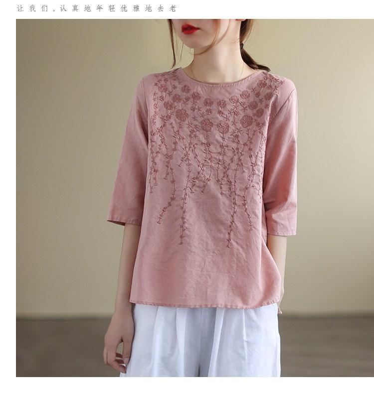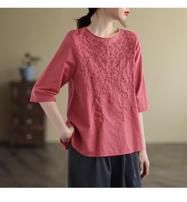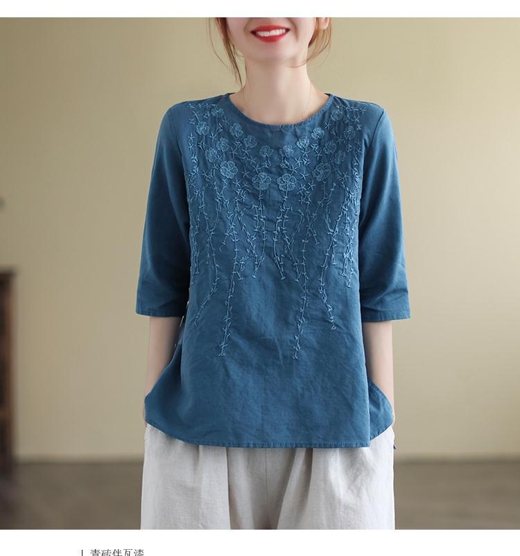 예술적 레트로 코튼 린넨 티셔츠 자수 탑 여성용 7 점 슬리브 느슨한 라운드 넥 솔리드 컬러 슬리밍 연령 감소 풀오버 셔츠