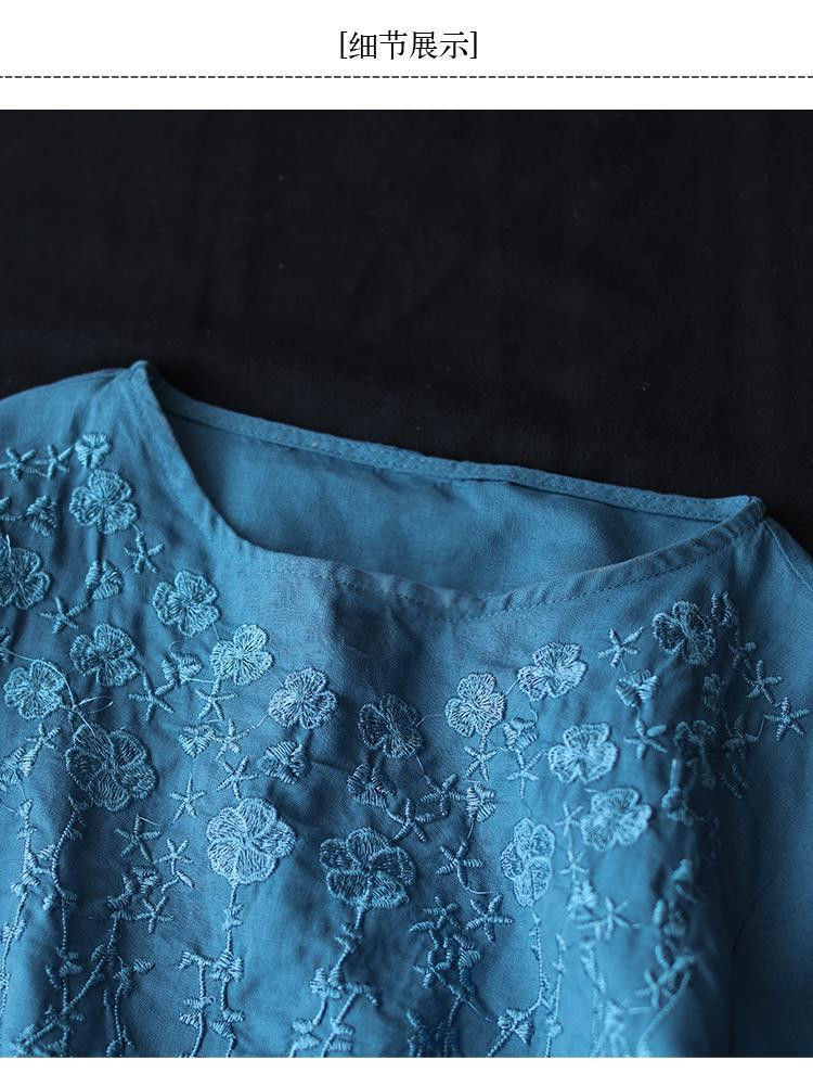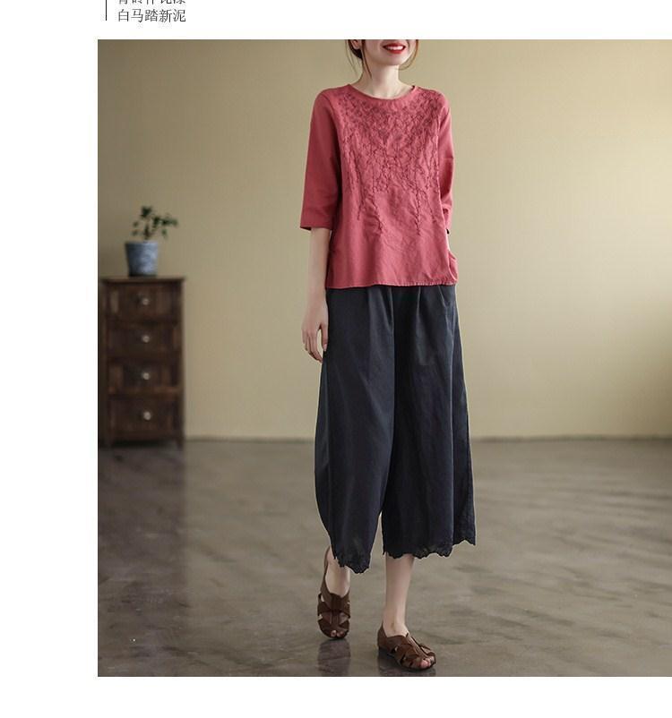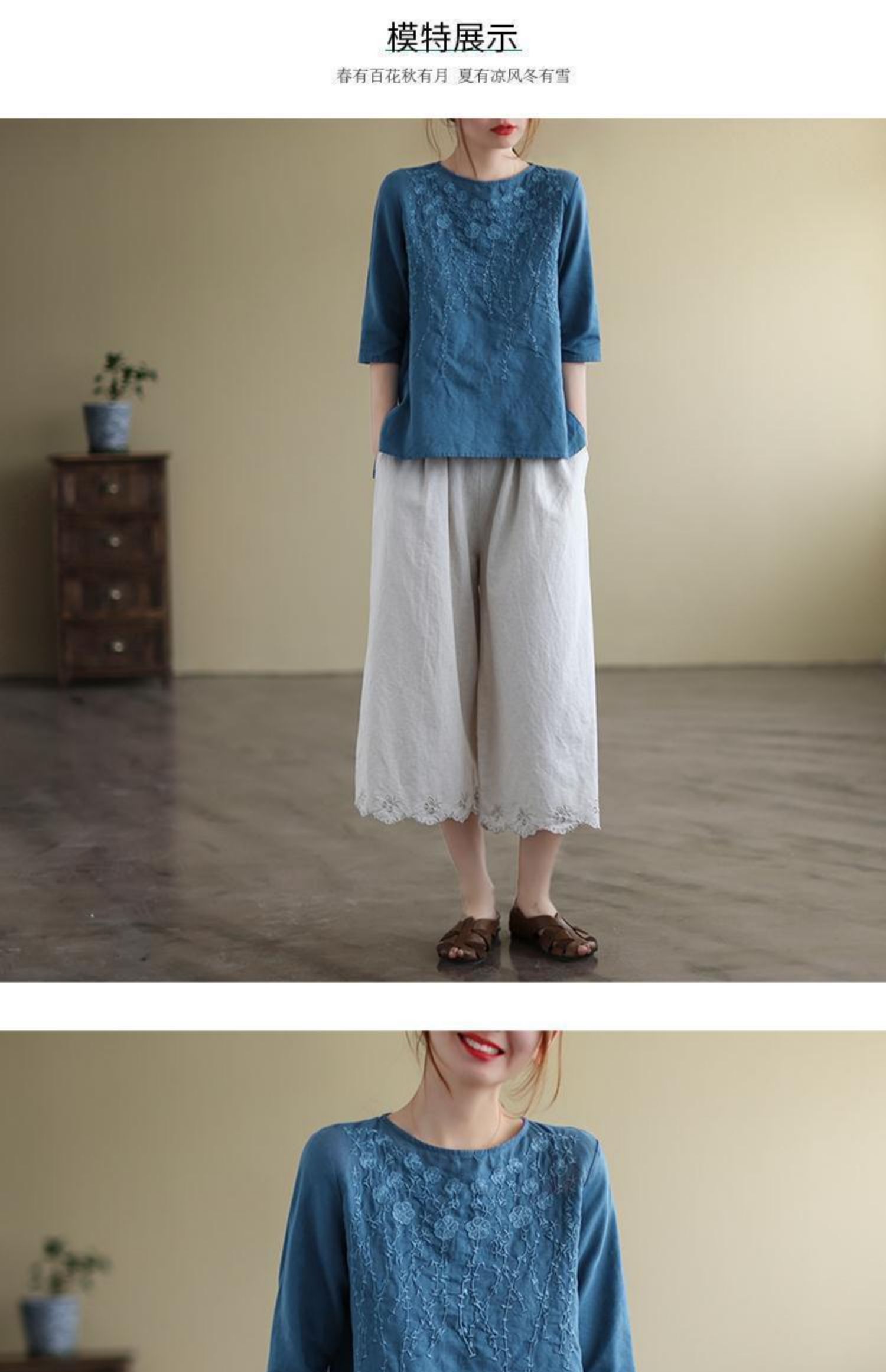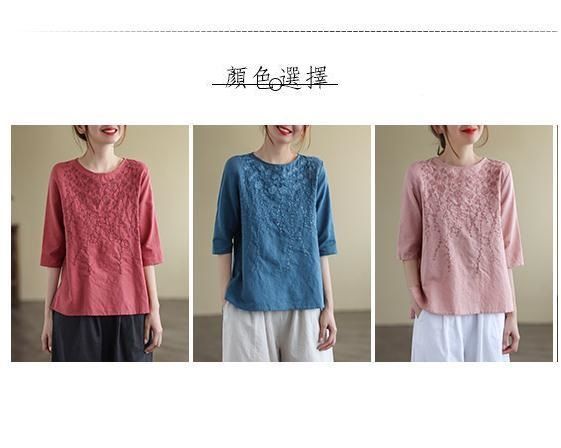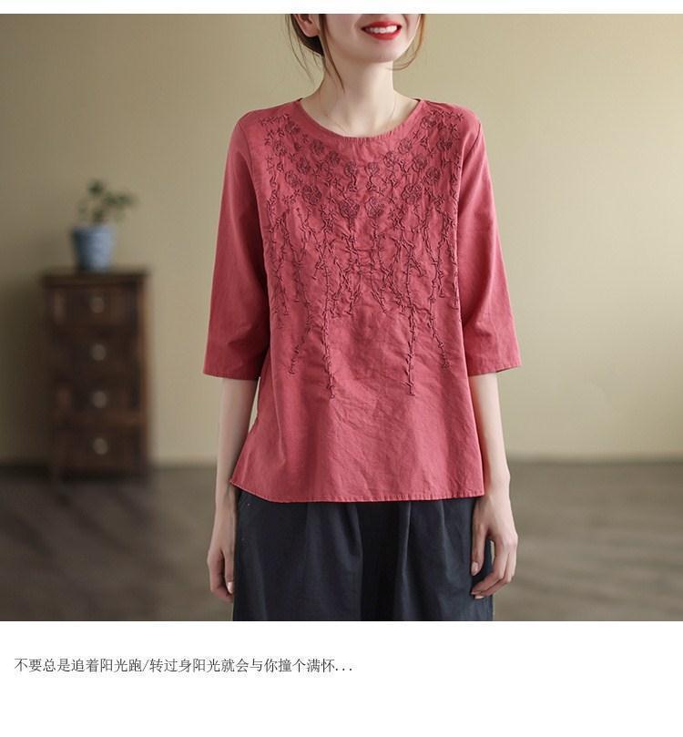 예술적 레트로 코튼 린넨 티셔츠 자수 탑 여성용 7 점 슬리브 느슨한 라운드 넥 솔리드 컬러 슬리밍 연령 감소 풀오버 셔츠스토어 가기