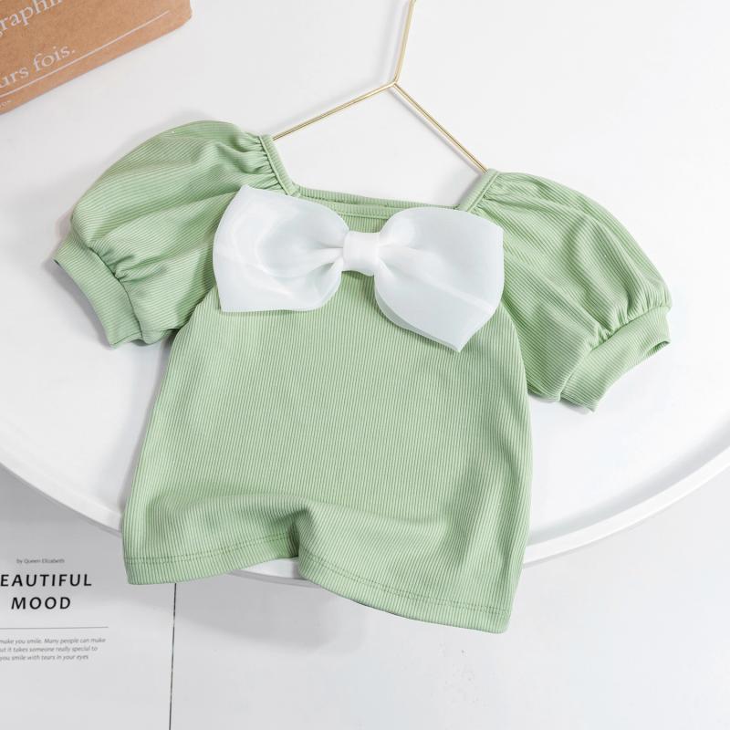 여아 2022 여름 새로운 한국 스타일 반팔 우아한 티셔츠 달콤한 활 아동복 아기 퍼프 슬리브 탑