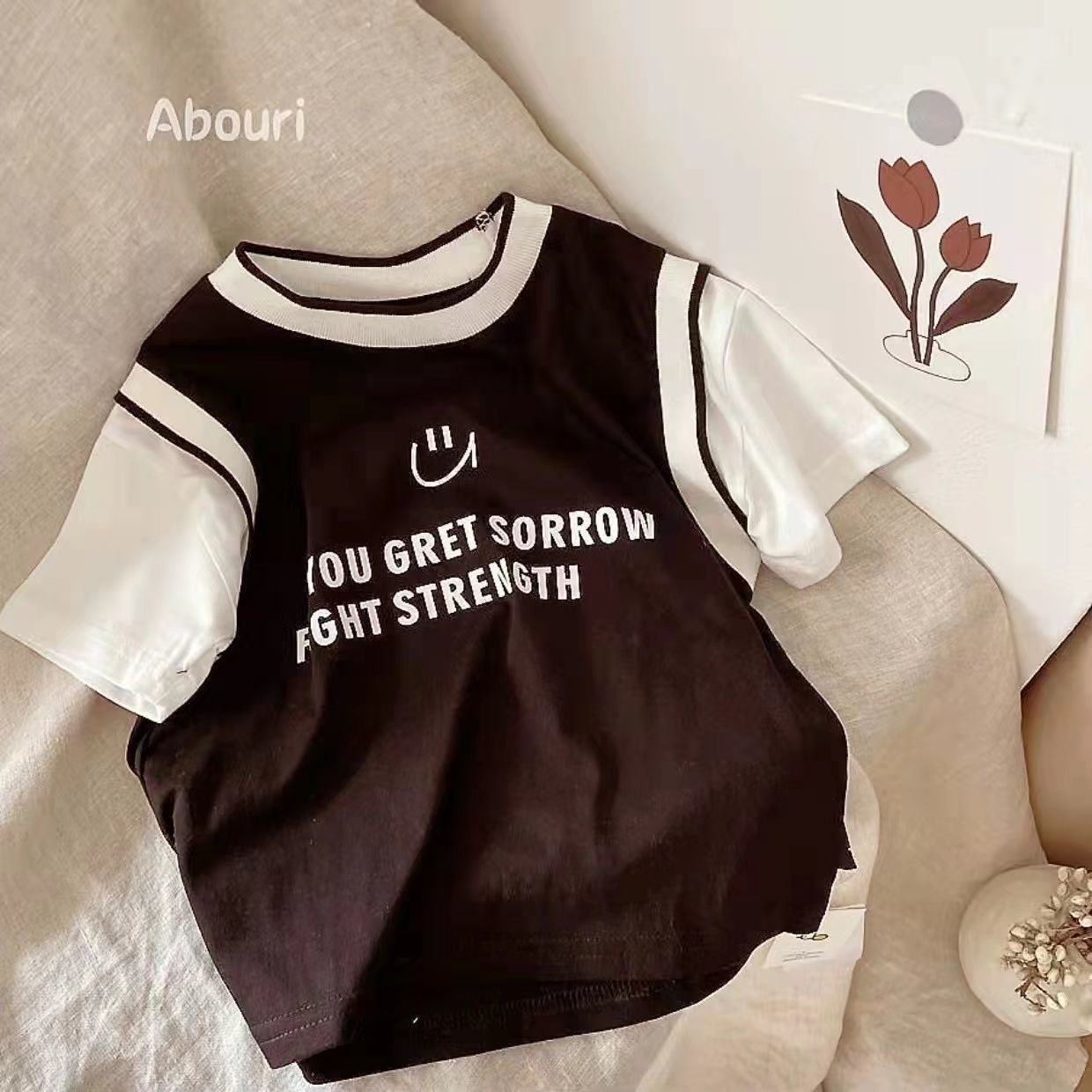 차오 팬 튀김 거리! 한국 스타일 어린이 면 가짜 투피스 티셔츠 2023 여름 새 소년 스트라이프 반팔 탑