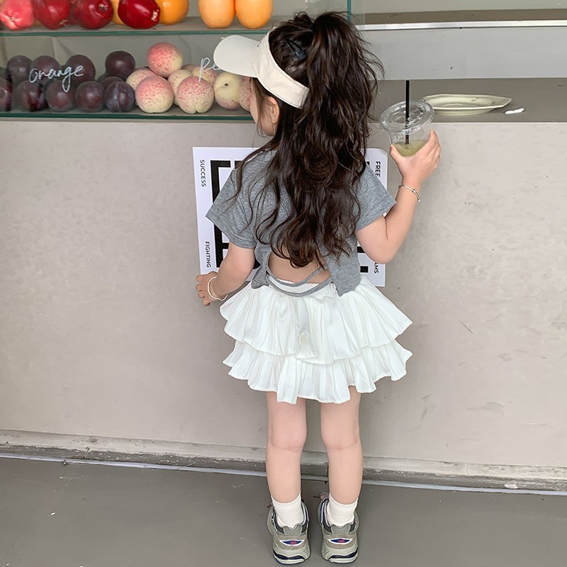 • 회색 등이없는 짧은 소매 화이트 케이크 스커트 내장 안전 바지