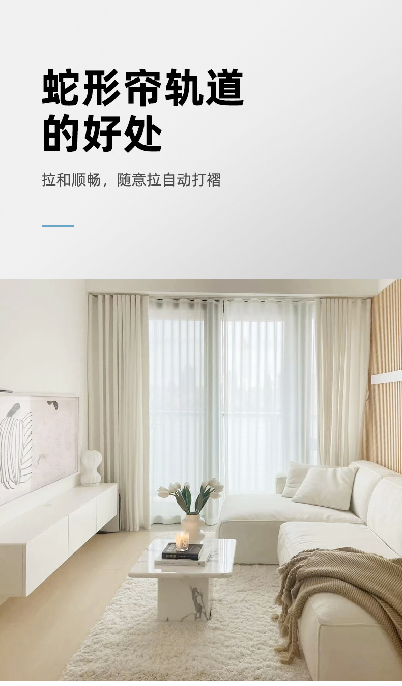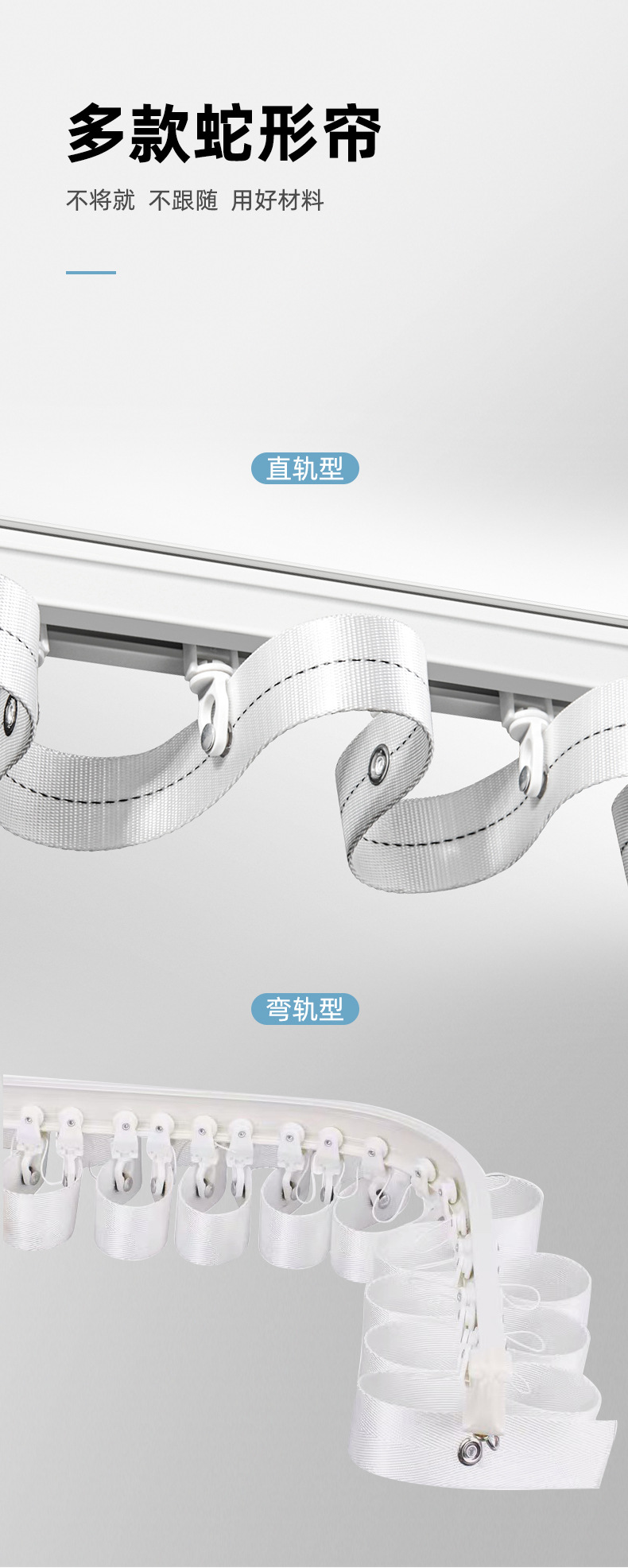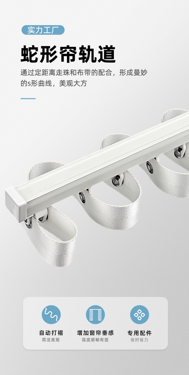 蛇形帘又名波浪帘,主要功能使布艺形成连续规则、充满韵律的波浪形效果,简约雅致,富有动感。蛇形帘开发初衷主要是解决传统挂钩挂布方式导致的布艺波纹形状大小及间距不一致。