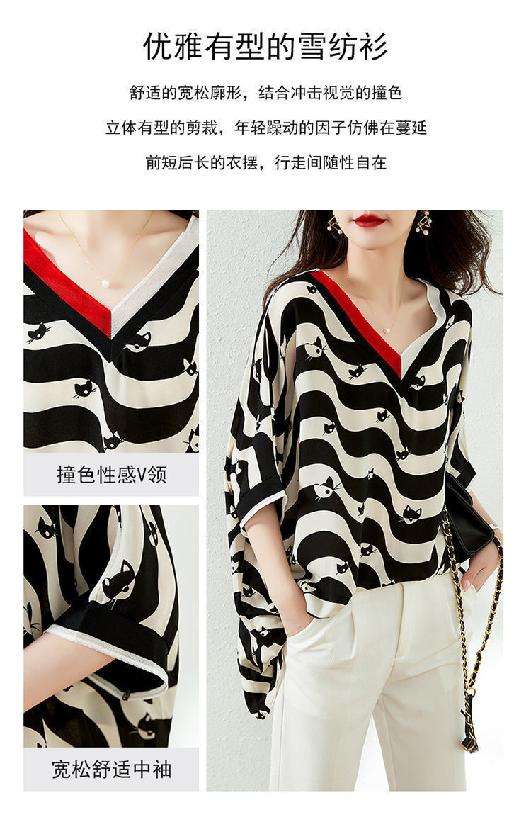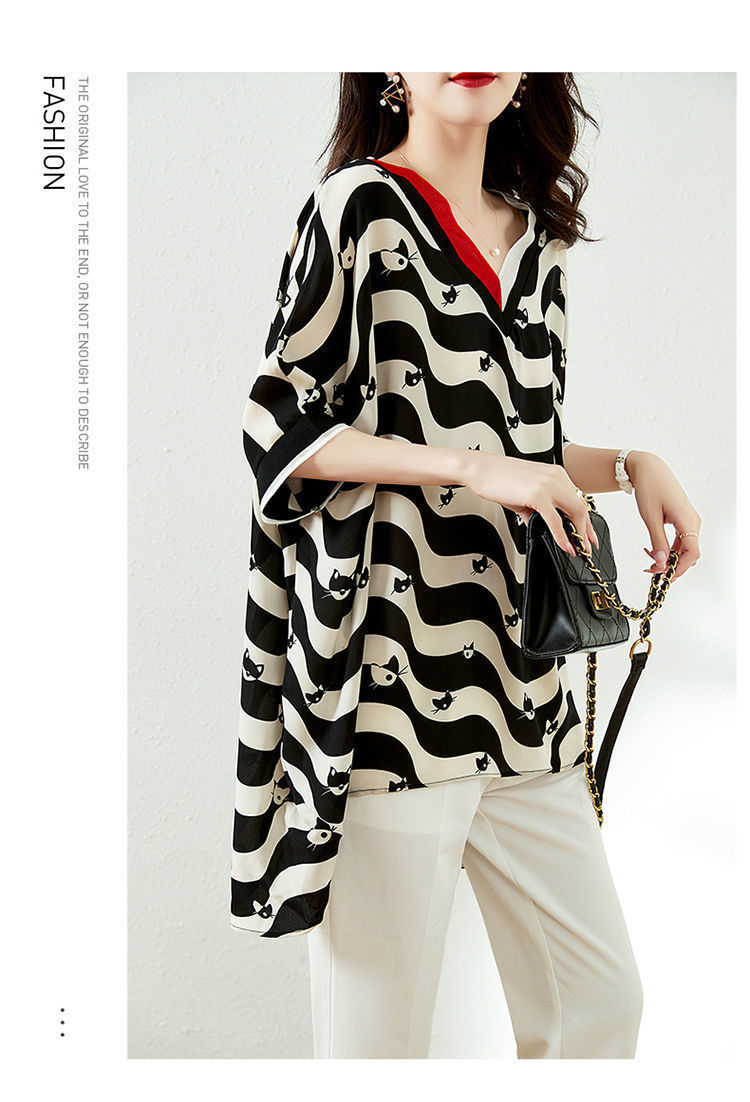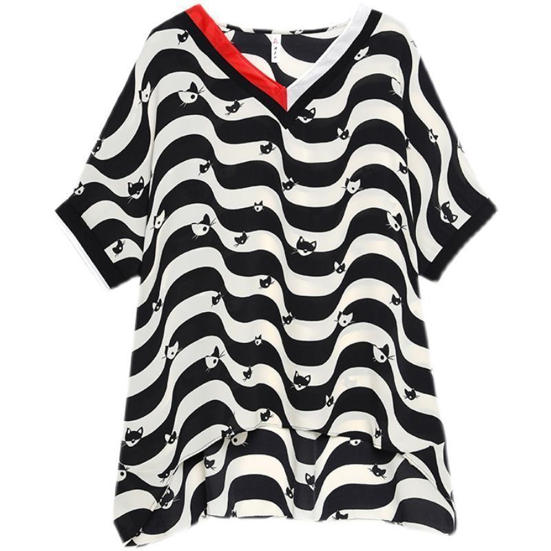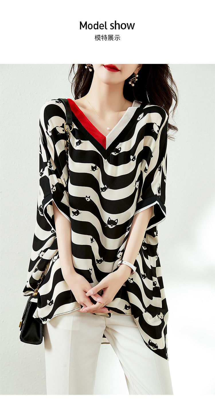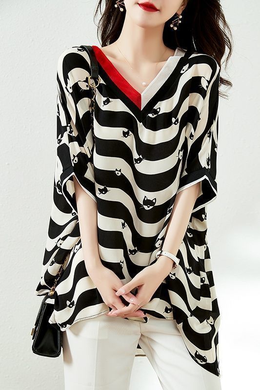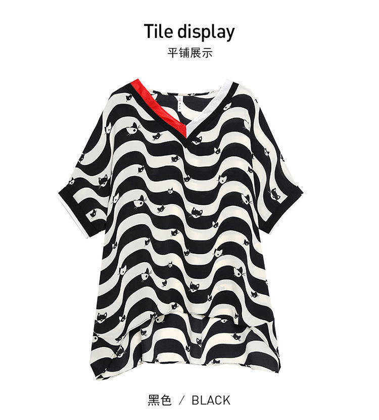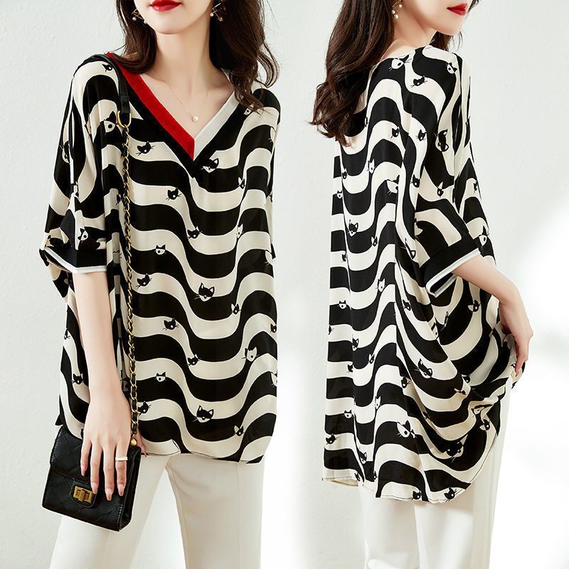 유럽 역 플러스 사이즈 V-넥 스트라이프 중간 소매 새로운 스타일 쉬폰 셔츠 세련된 느슨한 연령 감소 통통녀 여름 여성 패션스토어 가기