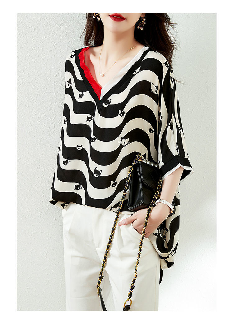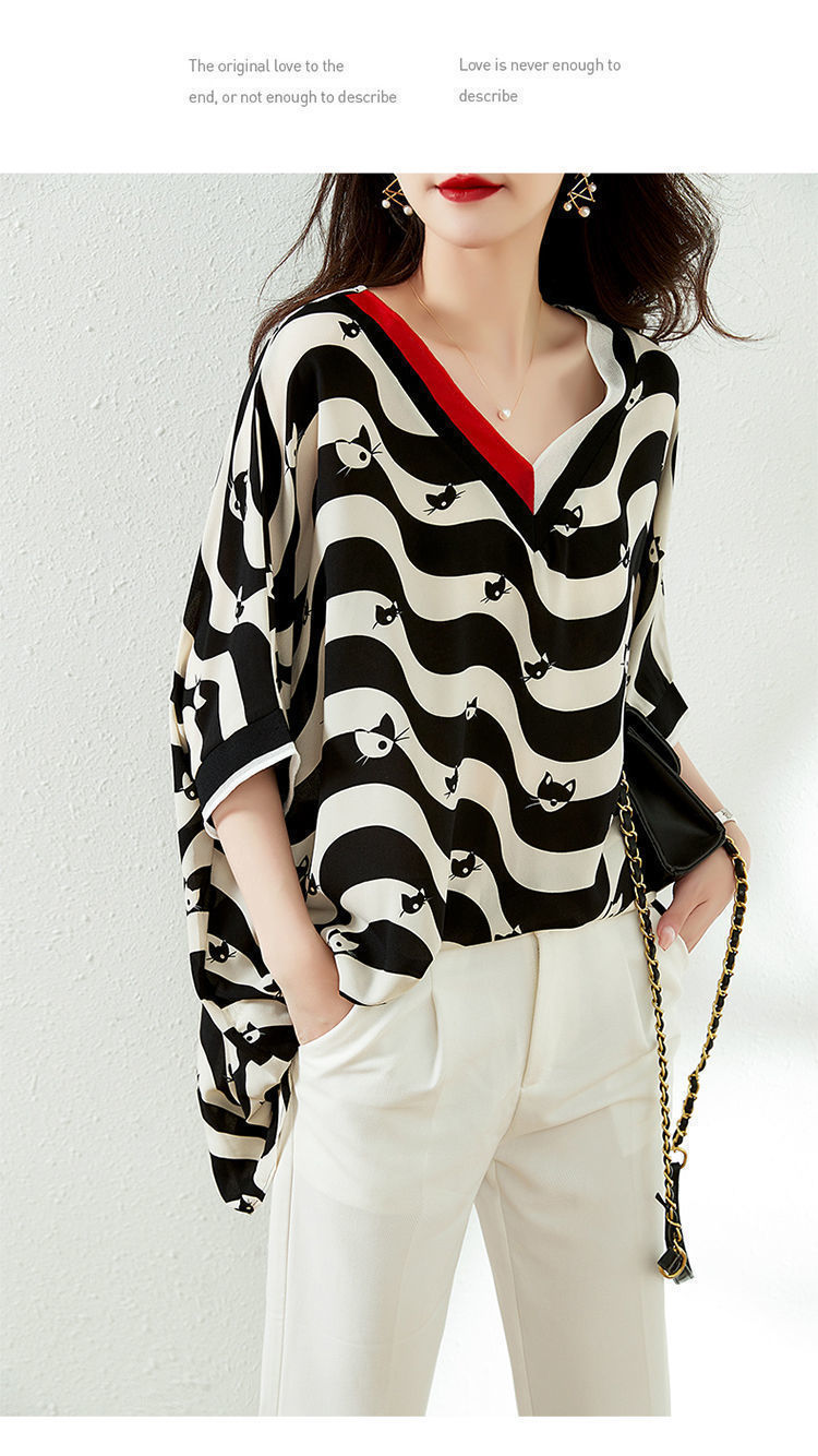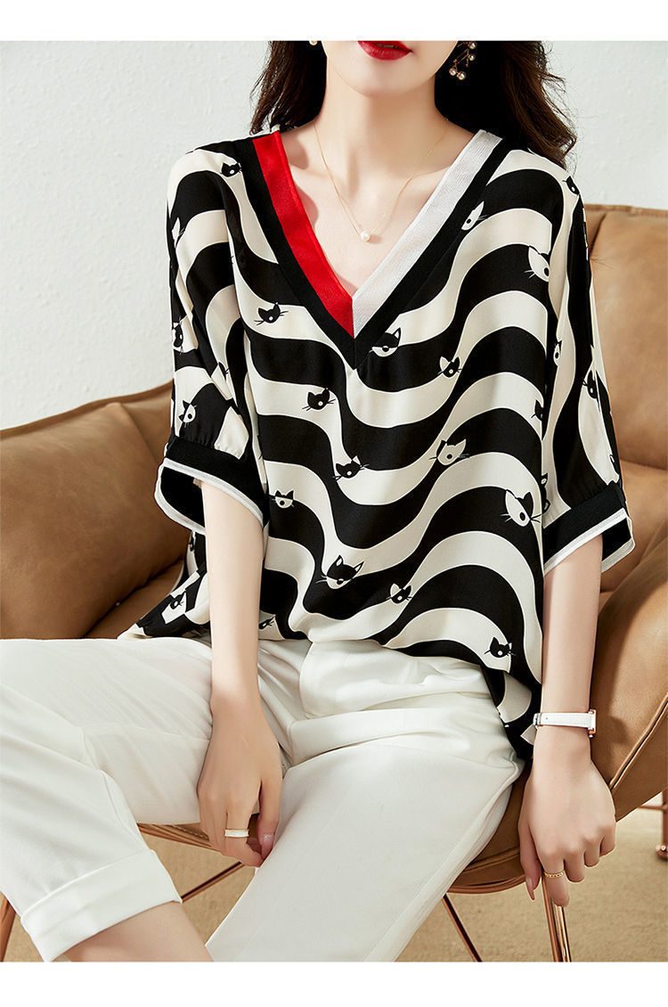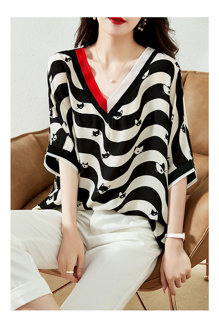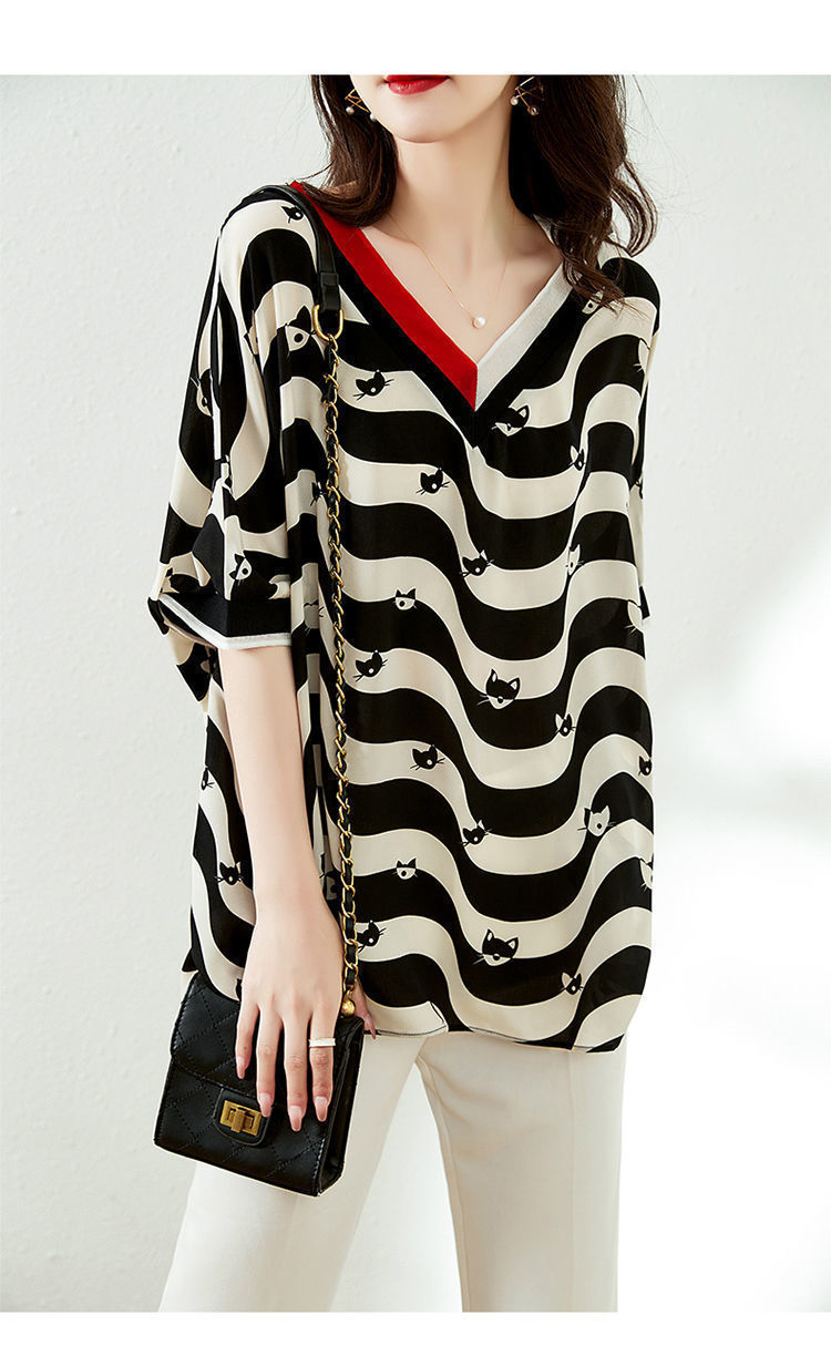 유럽 역 플러스 사이즈 V-넥 스트라이프 중간 소매 새로운 스타일 쉬폰 셔츠 세련된 느슨한 연령 감소 통통녀 여름 여성 패션스토어 가기