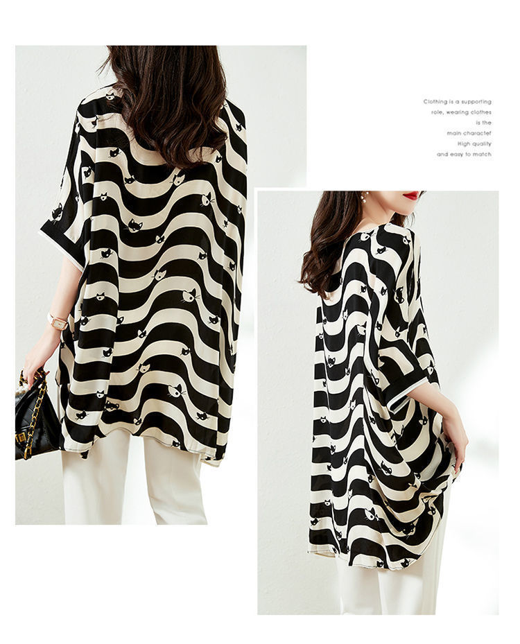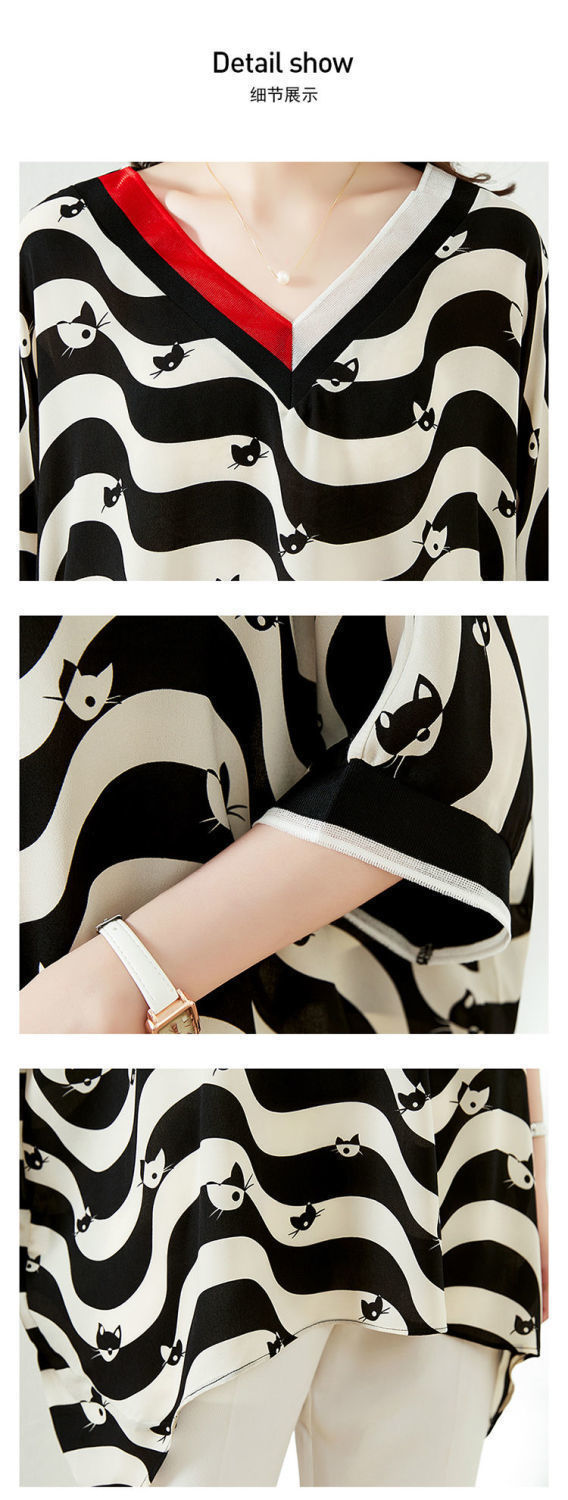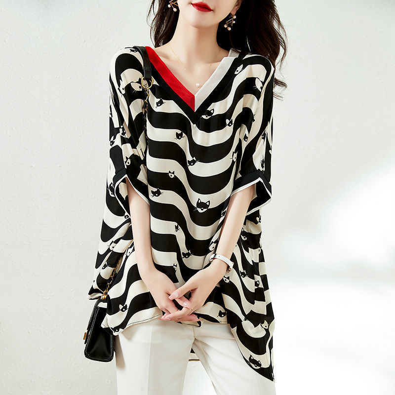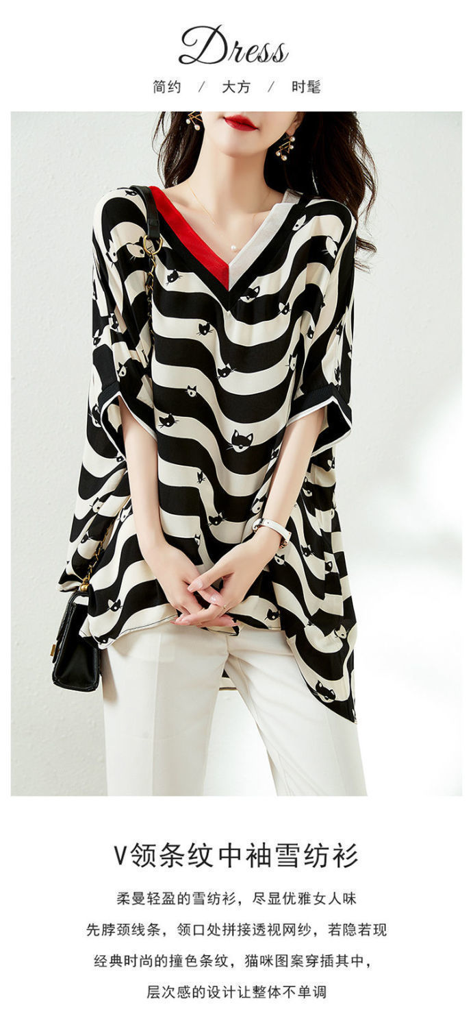 유럽 역 플러스 사이즈 V-넥 스트라이프 중간 소매 새로운 스타일 쉬폰 셔츠 세련된 느슨한 연령 감소 통통녀 여름 여성 패션