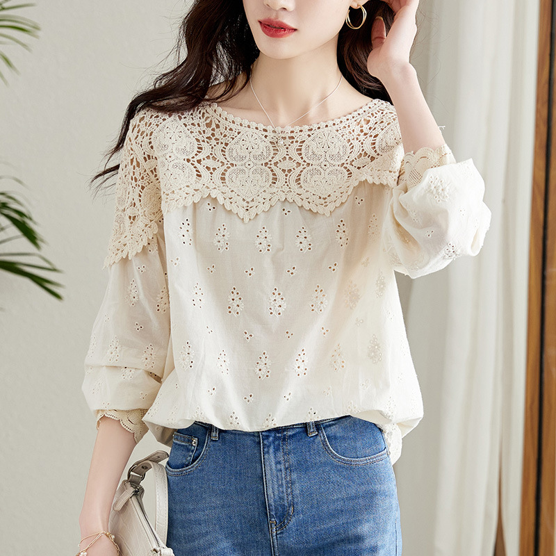 살구색 레이스 컷아웃 셔츠 여성용 긴팔 2025 봄 신상 디자인 감각 있는 니치 상의 독특한 순면 셔츠스토어 가기