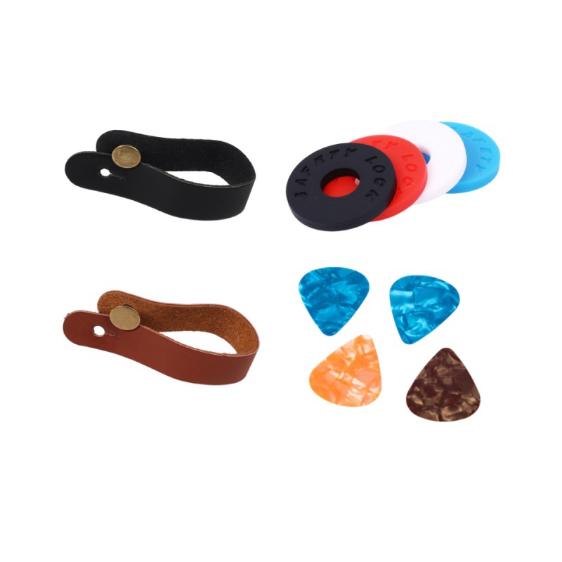 套餐G-10件套包含:琴颈带黑色*1;琴颈带咖啡色*1;硅胶背带扣*4(可要求统一颜色或者混色,下单请说明);0.46赛璐璐拨片*4