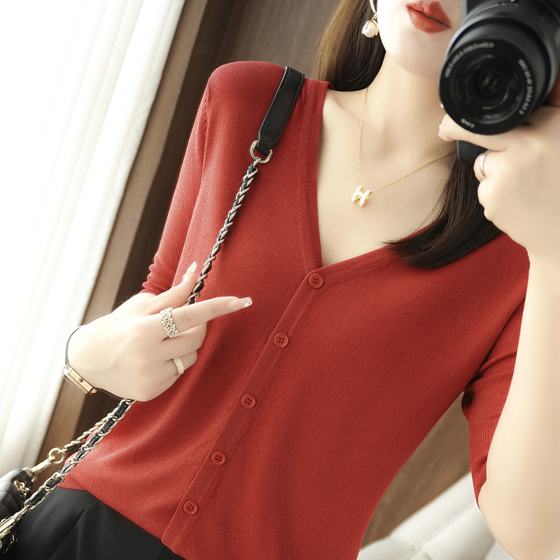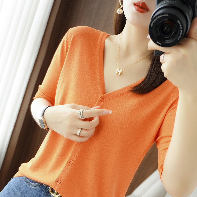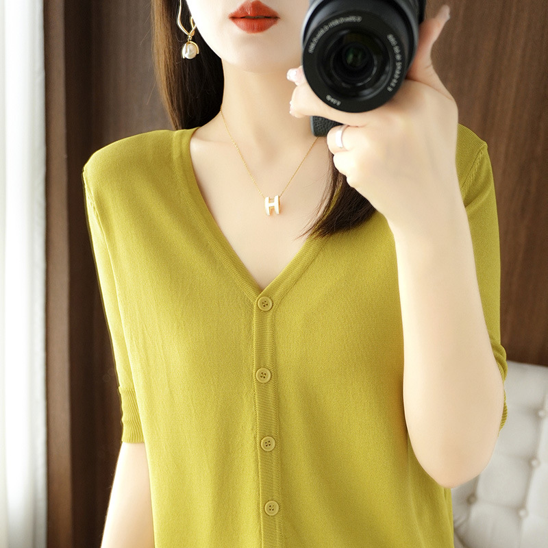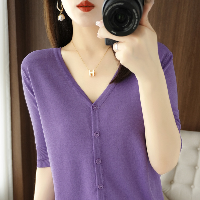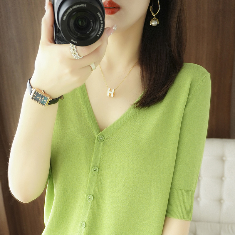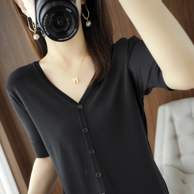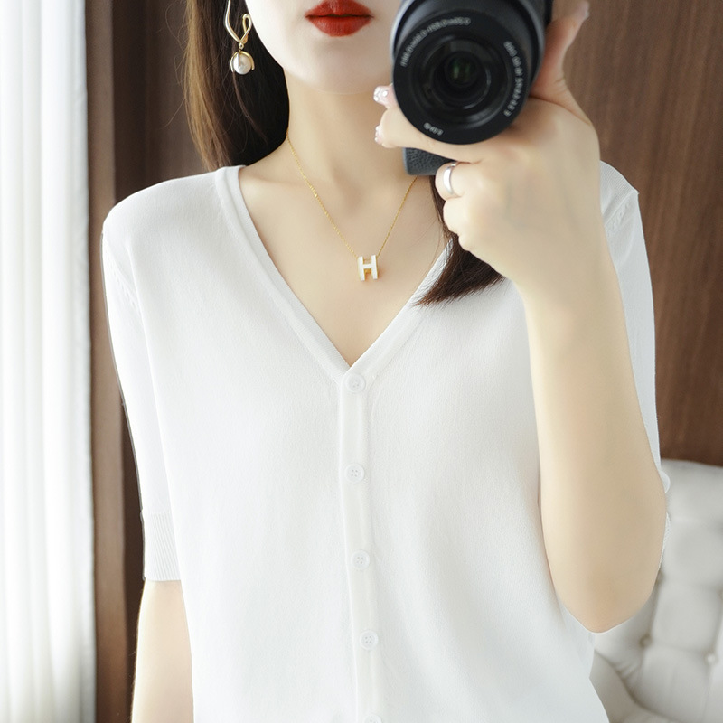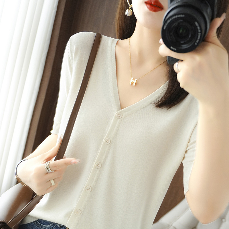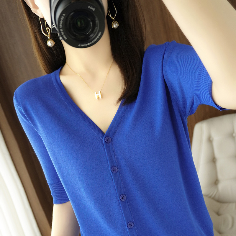 얇은 브이넥 반소매 아이스 실크 니트 가디건 여성용 느슨한 태양 보호 의류 여름 반소매 올매치 탑 베이스 셔츠