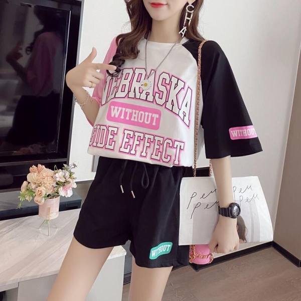 인터넷 유행 스포츠 스타일 티셔츠 세트 여성의 여름 옷 통통녀 편지 플러스 사이즈 반팔 탑 반바지 신선한 스타일 투피스 세트