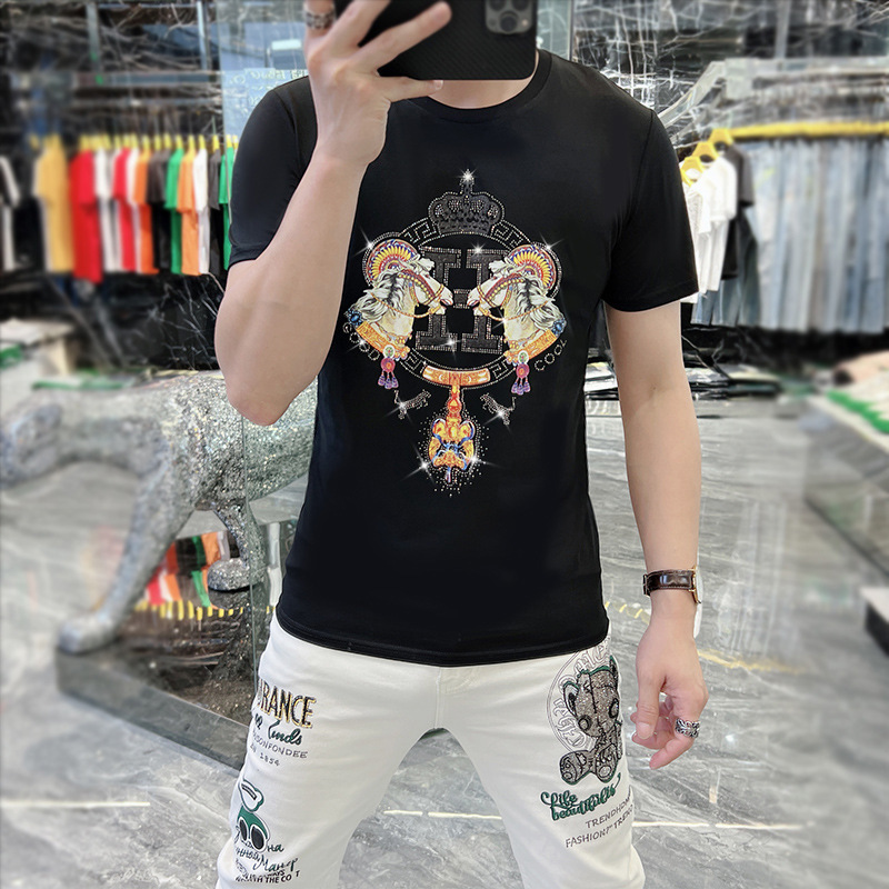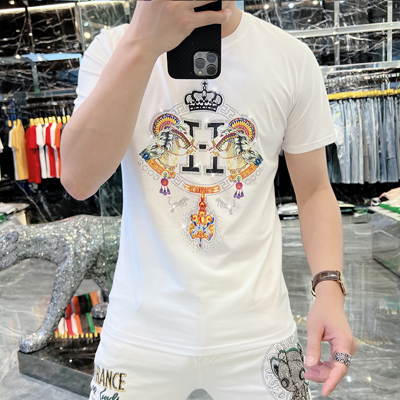 2024 새로운 여름 유행 남성 반팔 티셔츠 유럽 라운드 넥 캐주얼 성격 하이 엔드 H 홈 핫 다이아몬드 반팔 티셔츠 남성용스토어 가기