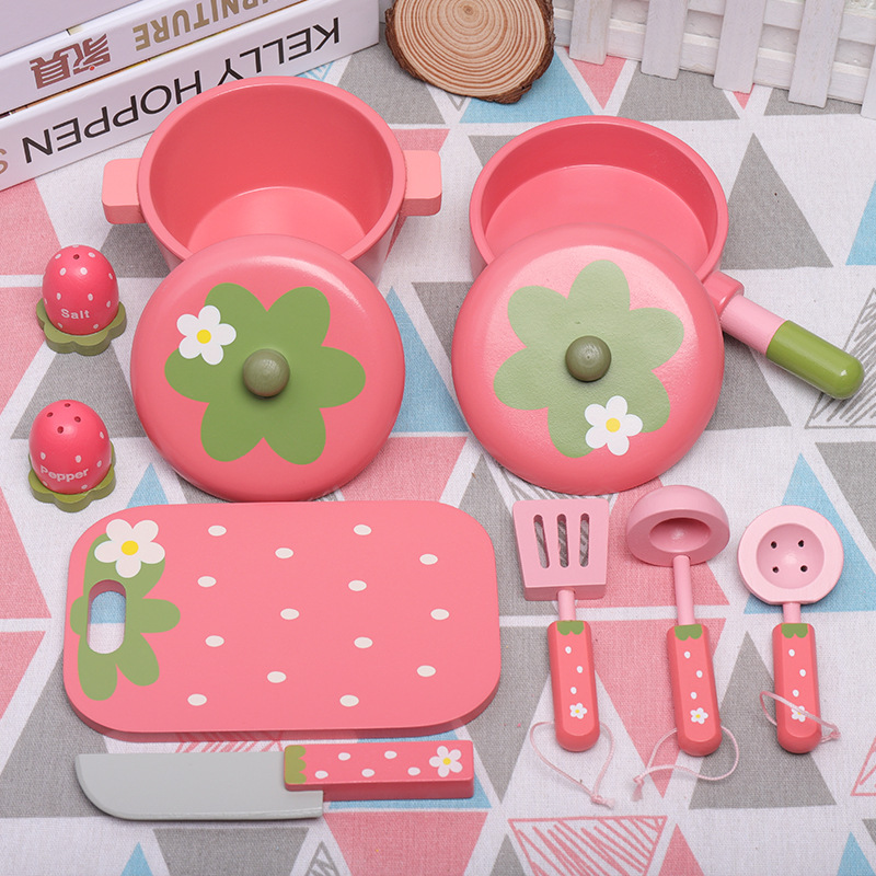 딸기 핑크 어린이 놀이 주방 시뮬레이션 장난감 소녀 공주 요리 주방 나무 냄비 세트