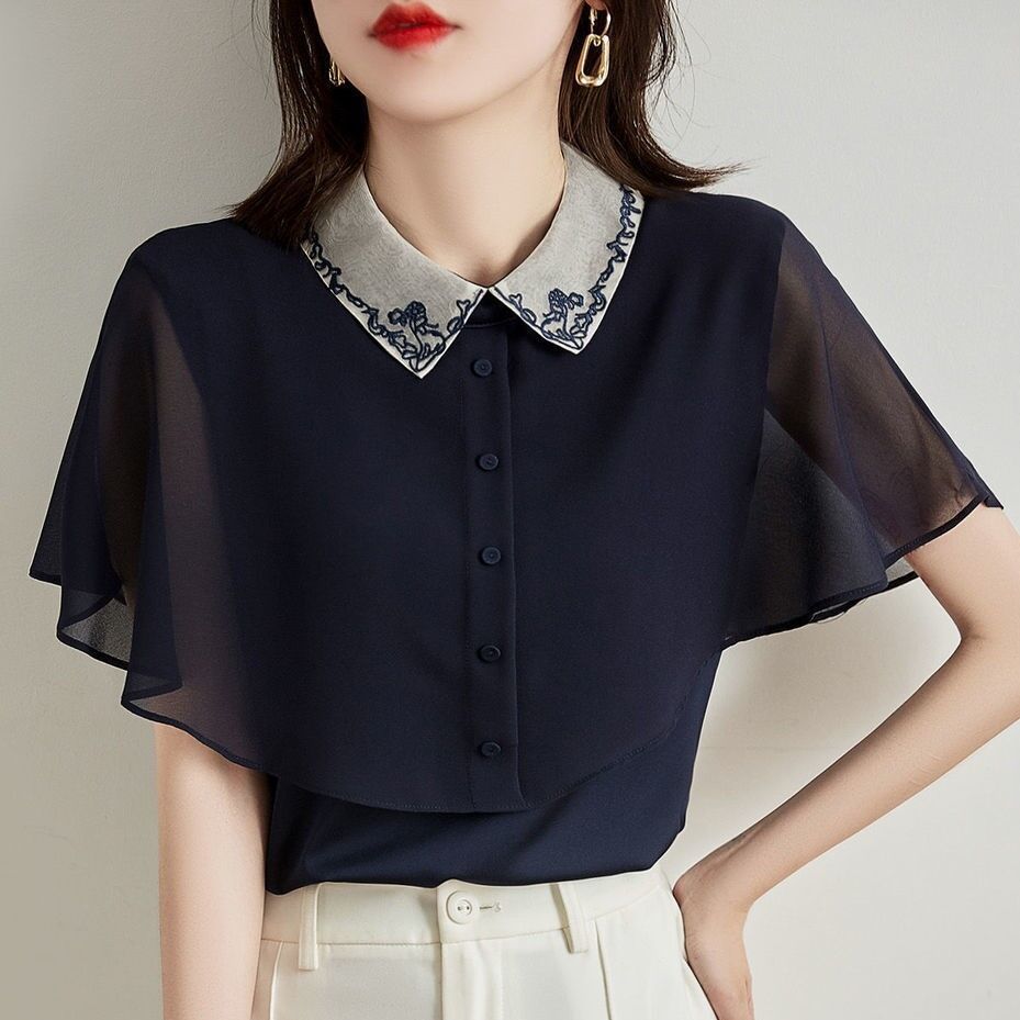 시폰 셔츠 여성 대외 무역 2025 여름 새로운 패션 옷깃 수 놓은 망토 탑 복고풍 홍콩 스타일 셔츠 트렌드스토어 가기