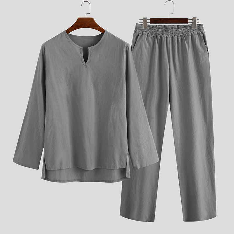 2024 새로운 솔리드 컬러 심플 루즈 버전 홈 셔츠 바지 긴팔 남성 홈웨어 캐주얼 슈트 재고 있음스토어 가기