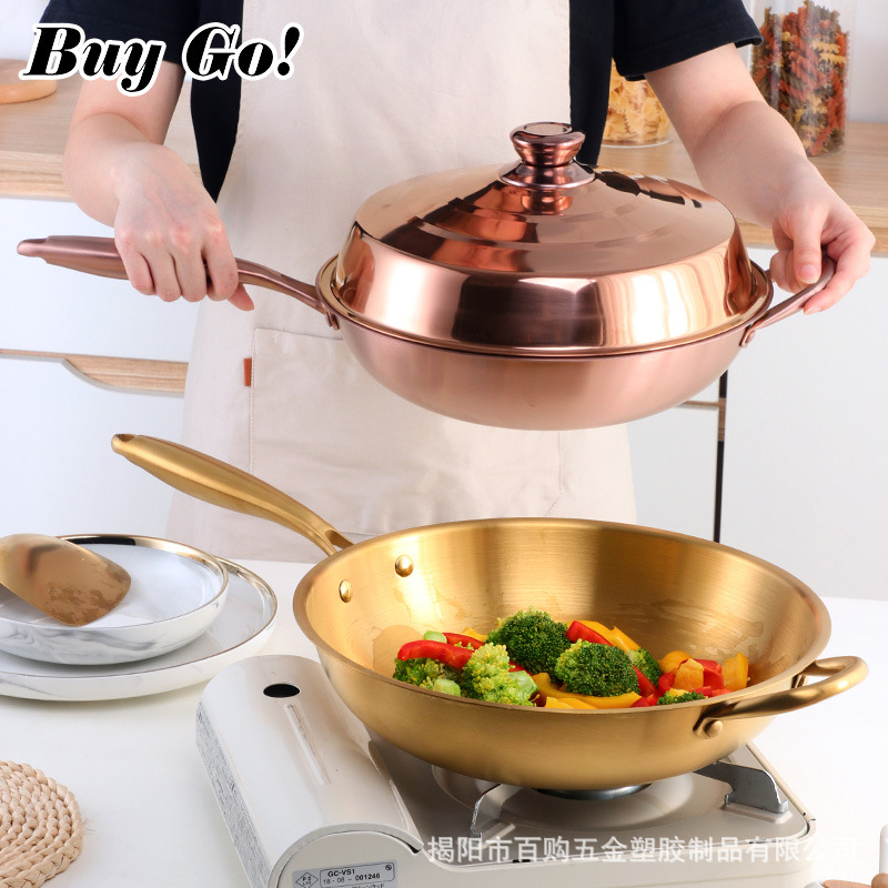 뚜껑이있는 스테인레스 스틸 플랫 바닥 웍 가스 렌지 논스틱 팬 두꺼운 코팅되지 않은 인덕션 쿠커스토어 가기